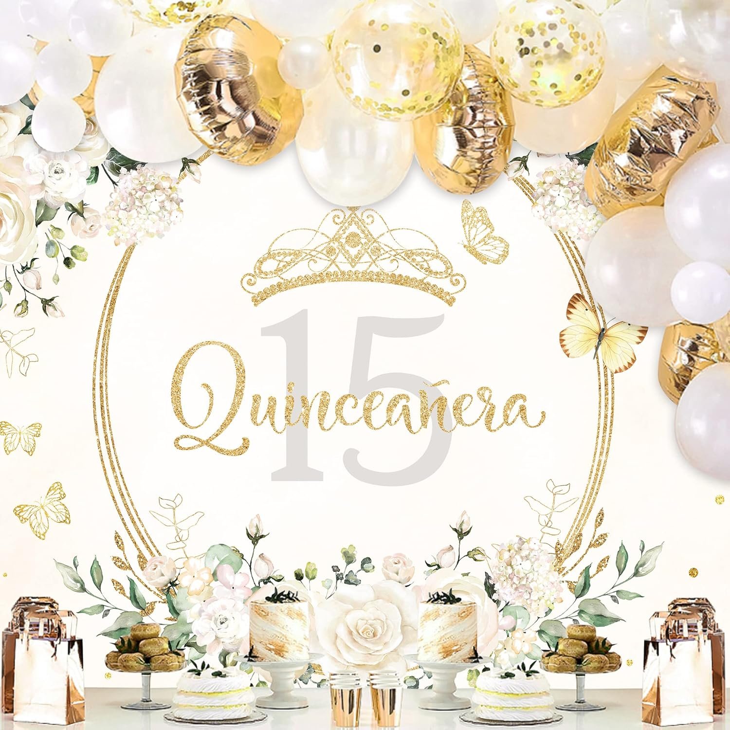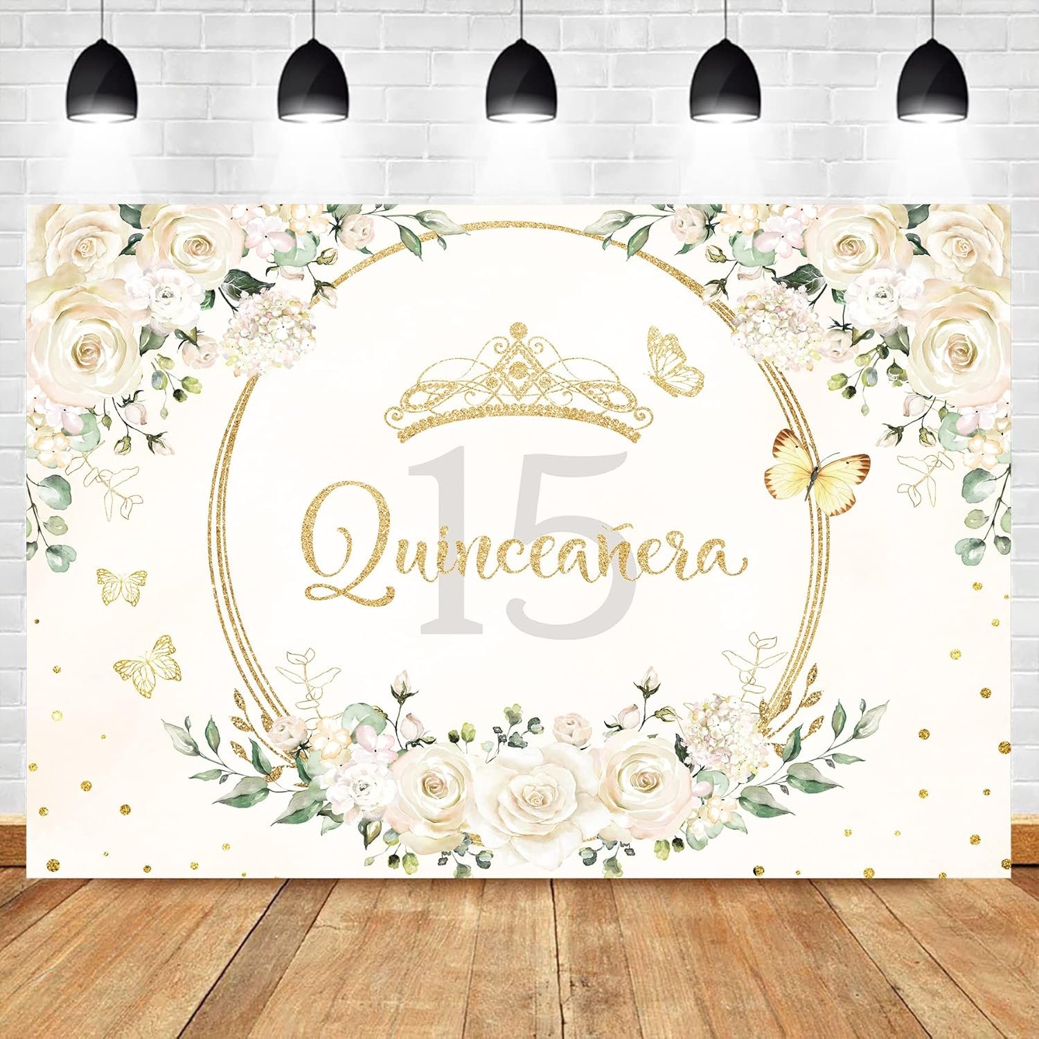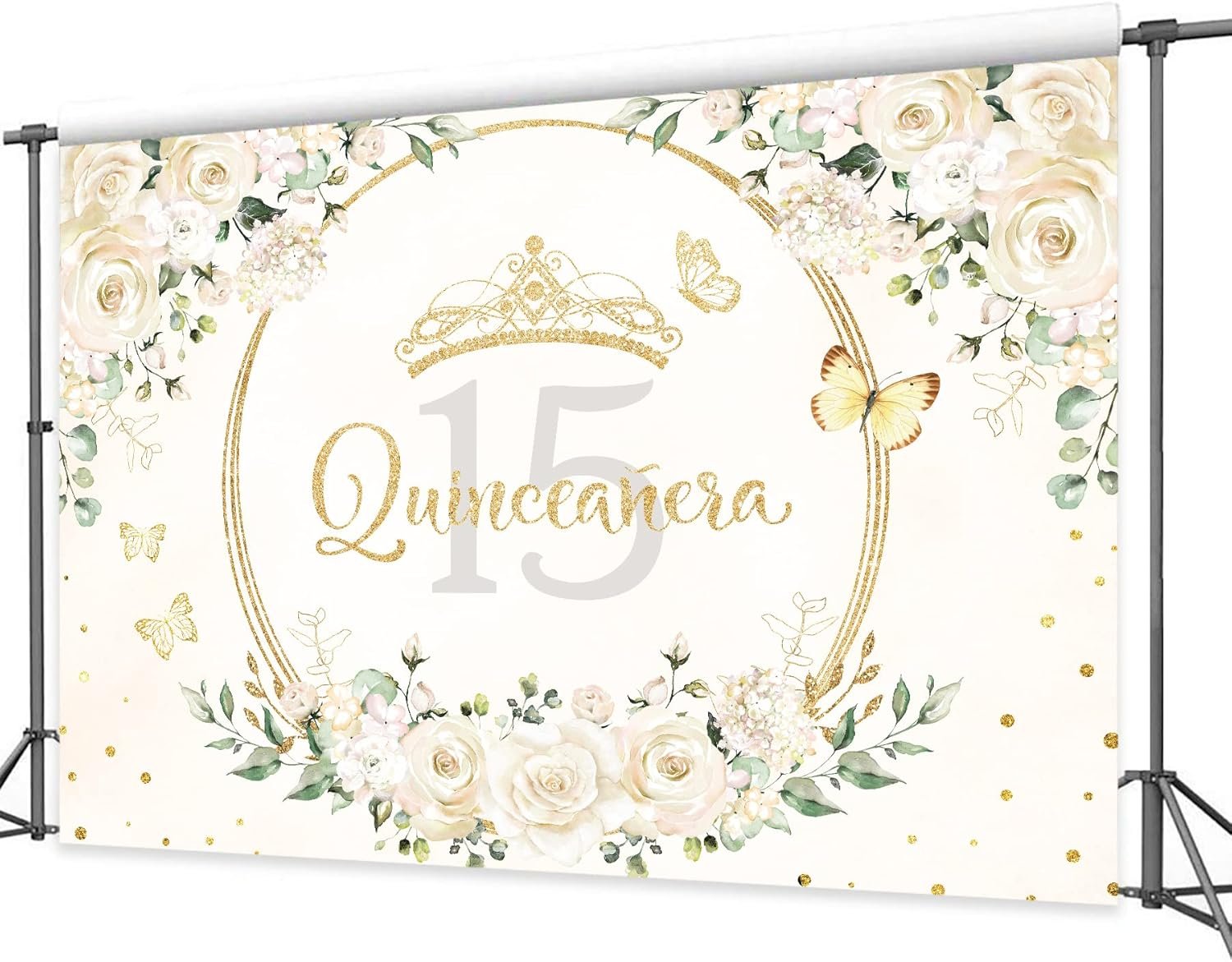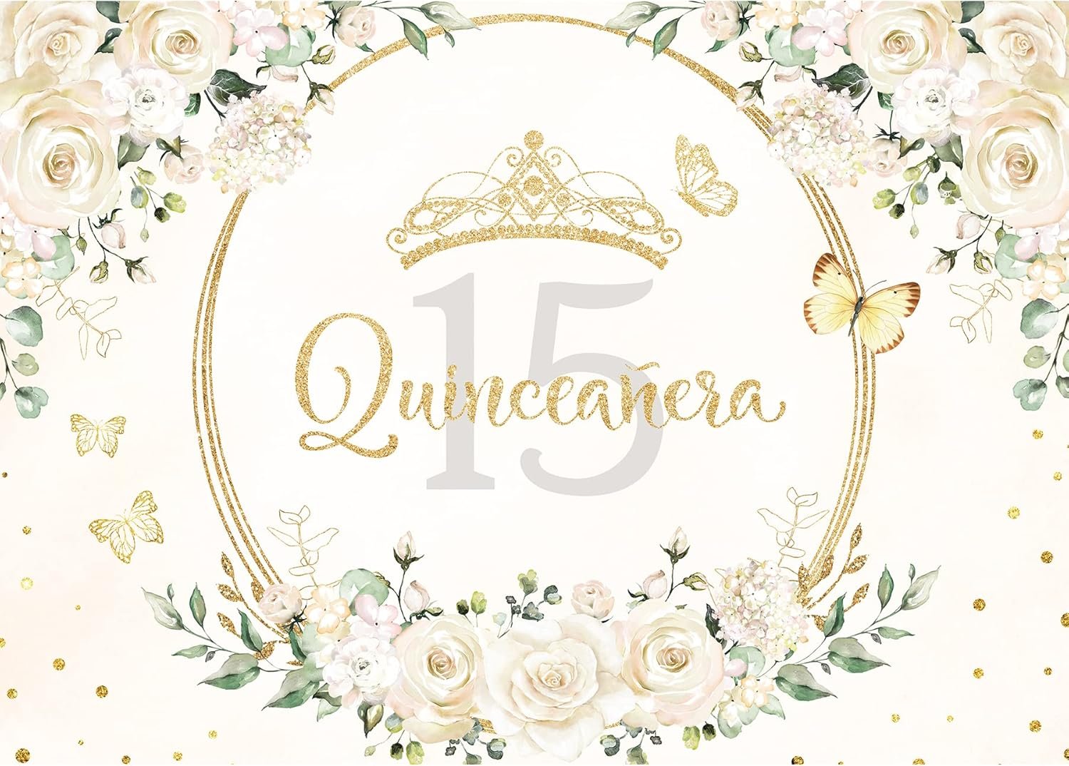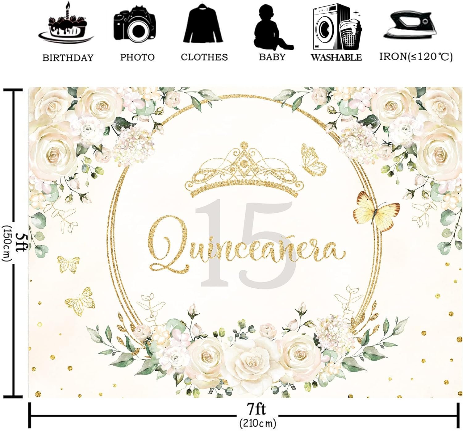 Homewelle Quinceañera Backdrop 7Wx5H Feet Polyester Fabric Mis Quince 15 Anos Birthday Party Decorations Supplies for Girl Princess White Floral Gold Crown Butterfly Photography Background Props