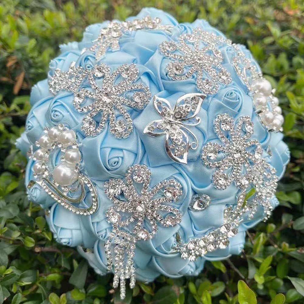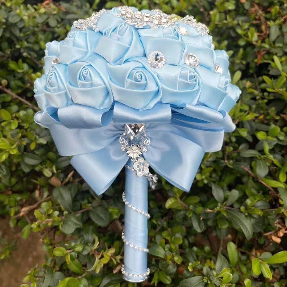 8.3 Inch Handmade Satin Rose Bridal Bouquet Toss Round Wedding Bouquet Throw Toss Artificial Flower Bunch Light Blue