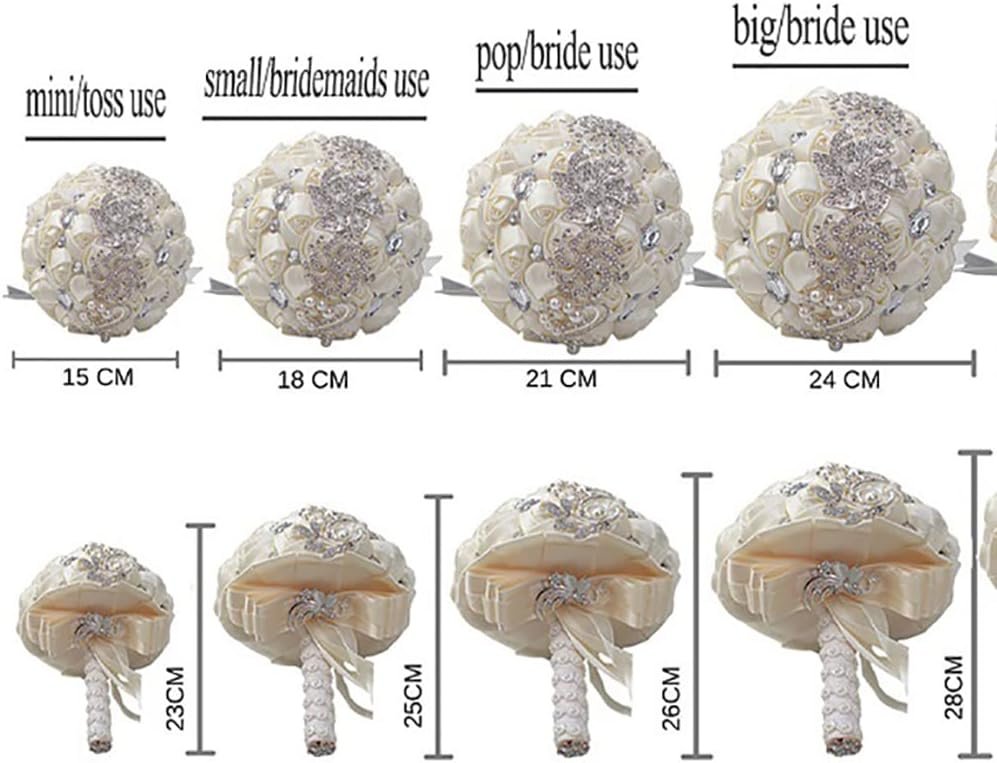 Recommend 5.9 inch mini bouquets for toss use, 7.1 inch small bouquets for bridesmaids and 8.3 inch or 9.4 inch big bouquets for the bride