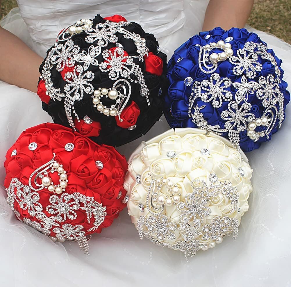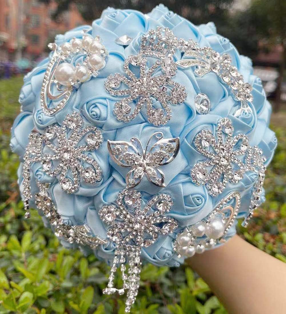 Made of soft silky satin fabric cloth, crystal rhinestones, alloy and artificial gems and pearls, beautiful and sturdy; flower corolla decorated with vintage and quaint platinum/silver white jeweled brooches and baubles; handle with artificial diamonds and dangly jewel chains, tassels, satin ribbon bow tie and shiny beads; antique ornaments are glued properly on the non floral brooch bouquet