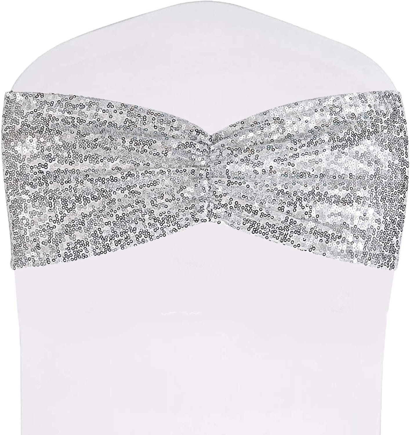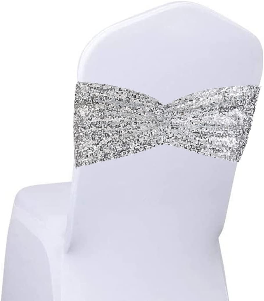 SquarePie Pack of 20 Sequin Chair Sashes Shiny Silver Bows Bands for Wedding Banquet Party Decor