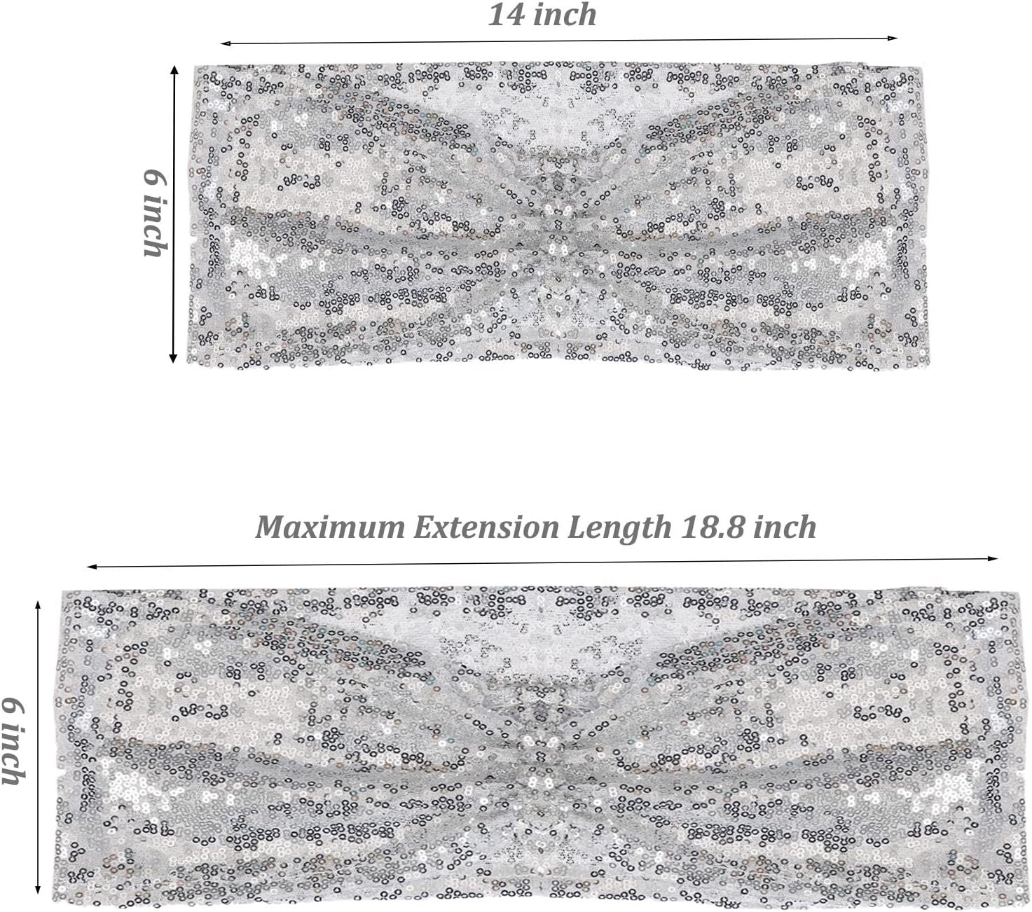 Size: 6 ×14 inches / 15 × 35 cm, stretch to fit most banquet chairs . Package: 10 PCS; 20 PCS; 50 PCS.