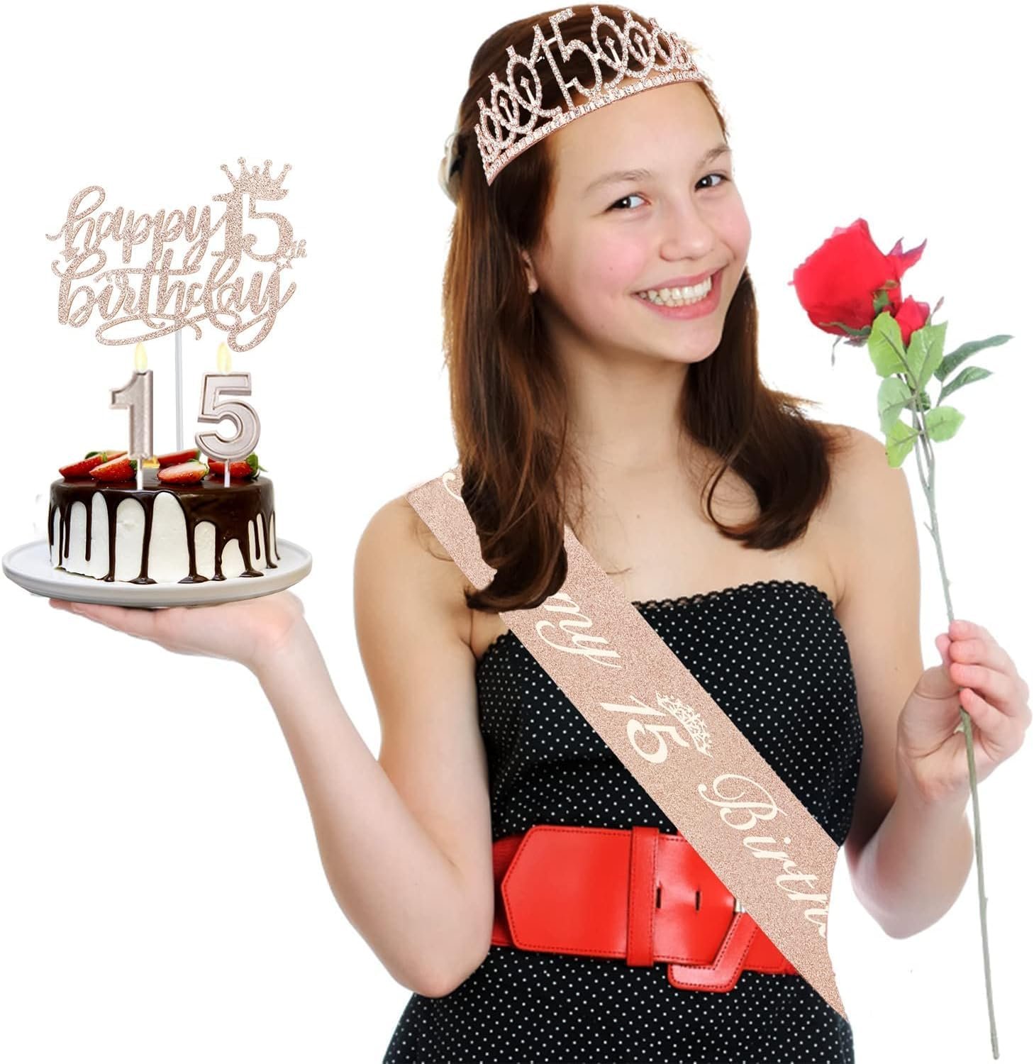 15th Birthday Decorations for Girls, Including Sash, Crown/Tiara, Candles, Cake Toppers. 15th Birthday Gifts for Girls