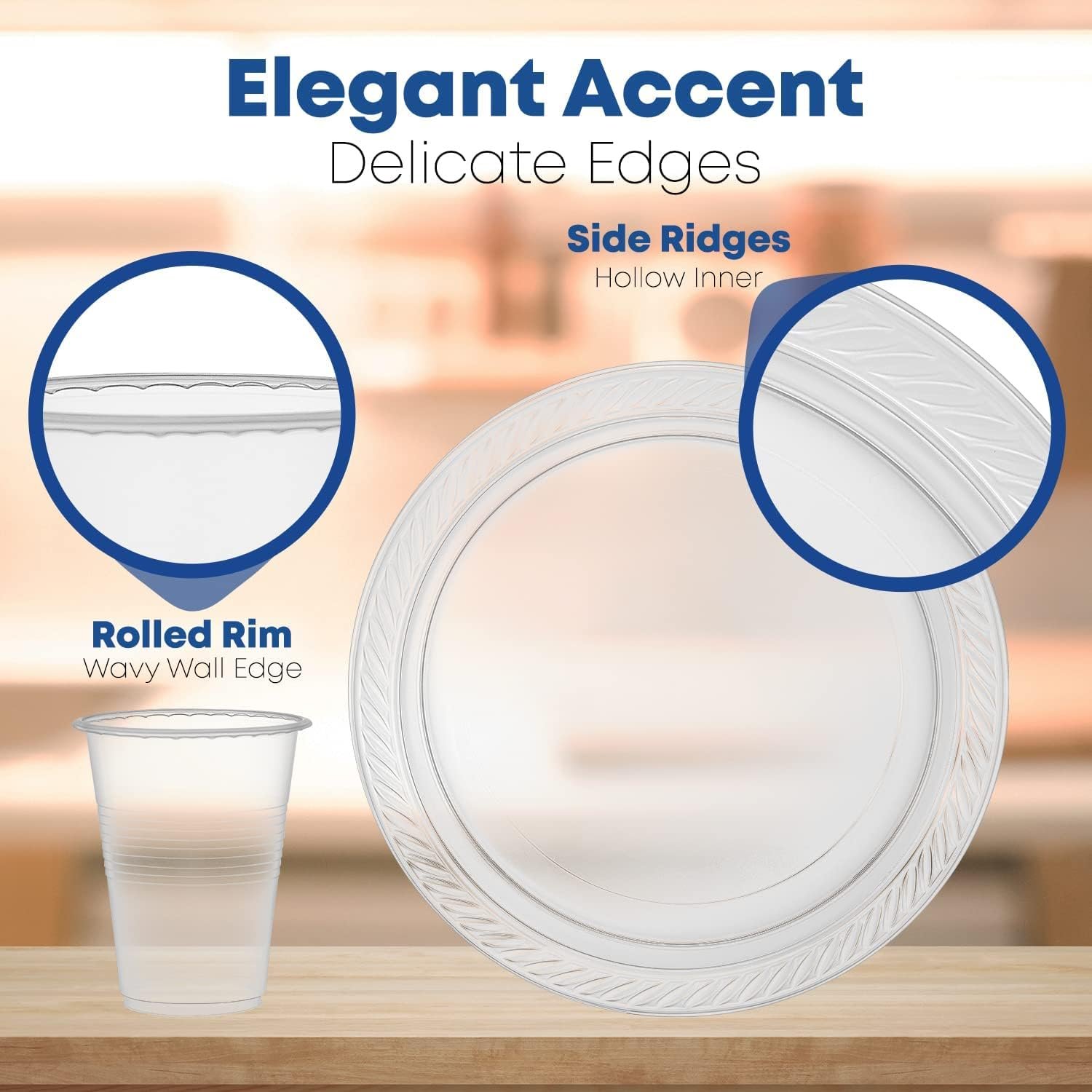 PREMIUM CONSTRUCTION. This clear plastic dinnerware set has side ridges that prevent food spills and a thick heavy-duty layer for efficient hot and cold food servings. It is made with food-grade and BPA-free material, ensuring no harmful substances can sip in your food and drinks.