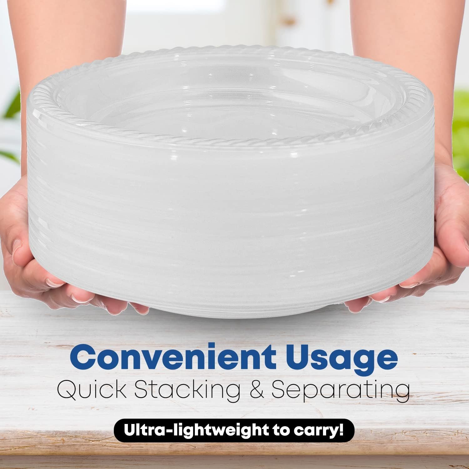 MICROWAVE FRIENDLY. Crafted with efficiency and functionality, these plastic party plates have heat dispersion feature that has the ability to withstand temperature making your meal freshly served while using your microwave oven.