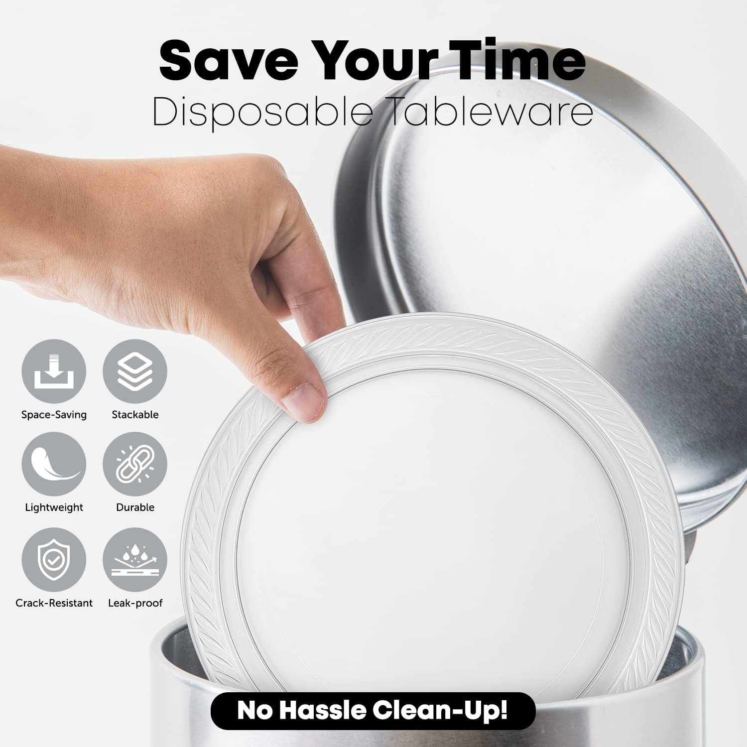 HASSLE-FREE CLEAN-UP. Skip the struggle of washing dishes with these disposable utensils, cups, and plates! Made from sturdy material, you can also have the option to reuse this dishwasher-friendly set. Level up your meals with this clear plastic plates and plastic cutlery set, both disposable and recyclable!