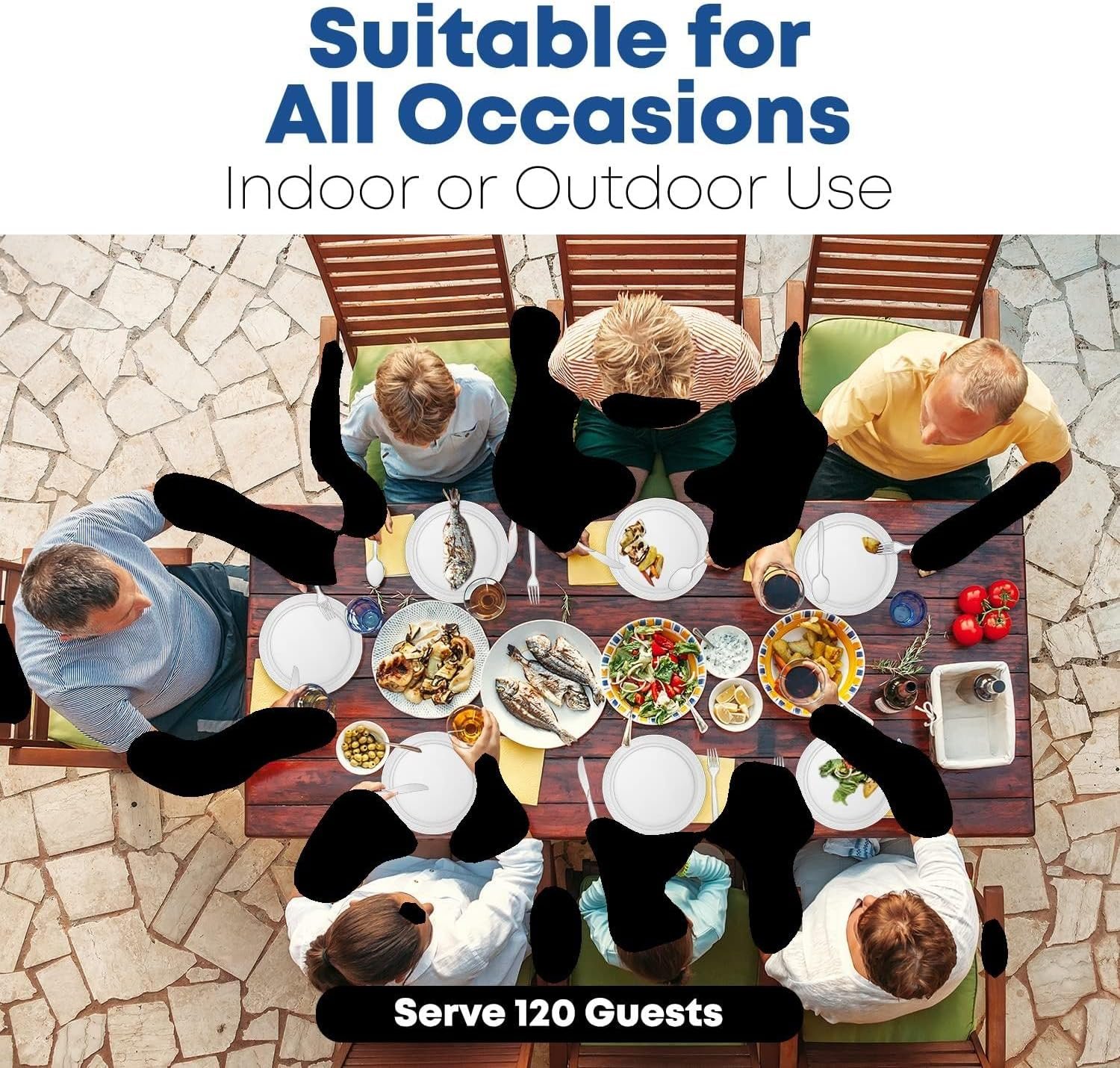 GREAT VALUE PACK. This disposable dinnerware set comes with everything you need for your next party or get-together. A complete set for 120 guests, this includes 120 x 9” dinner plates, 180 x 6” plastic dessert plates, 120 x 9oz cups, and 120 sets of disposable forks, spoons, and knives.