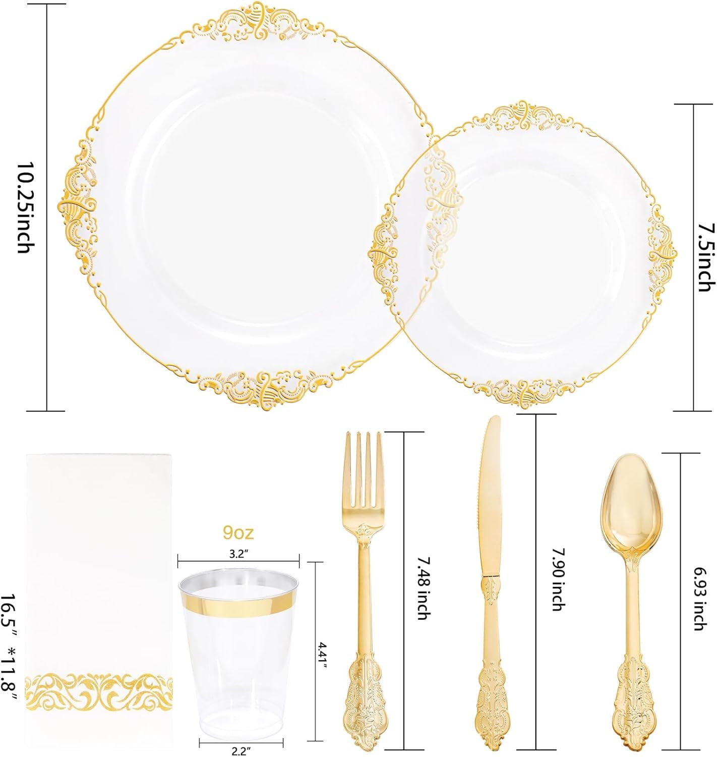 Great Value: Although intended for single-use, these Baroque-styled clear and gold rim plates offer a cost-effective alternative compared to traditional porcelain or ceramic ware. This gorgeous gold plates allows hosts to create an opulent atmosphere without the worry of breakage or the need for extensive post-event washing.