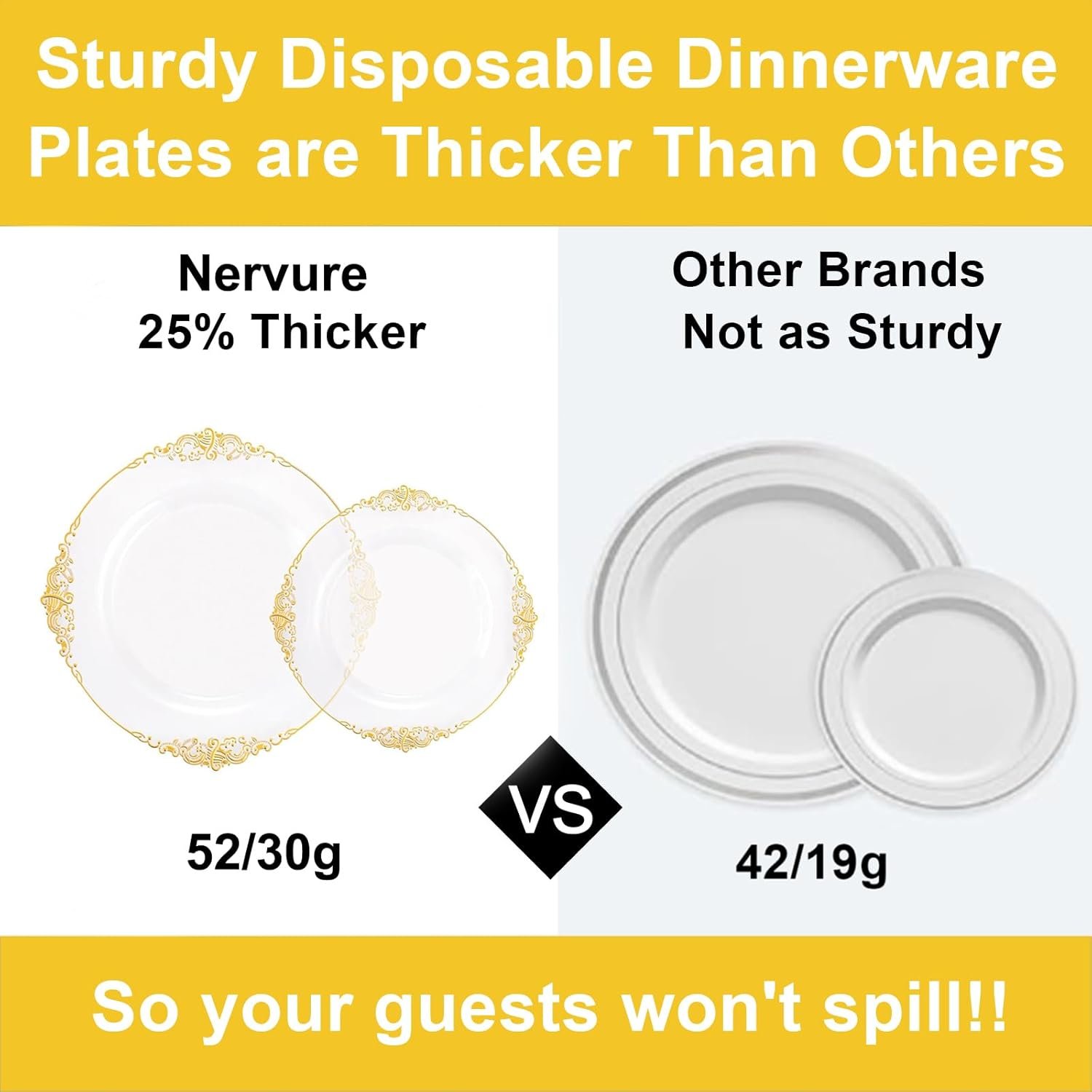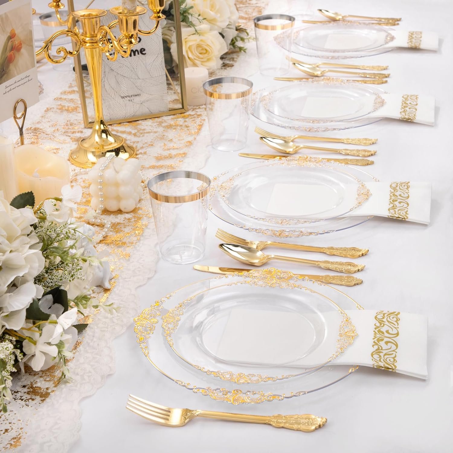 Nervure 350PCS Clear Gold Plastic Plates – Gold Plastic Dinnerware Sets for 50 Guests – 100 Gold Disposable Plates, 150 Gold Plastic Silverware, 50 Cups, 50 Napkins for Wedding & Party & Christmas