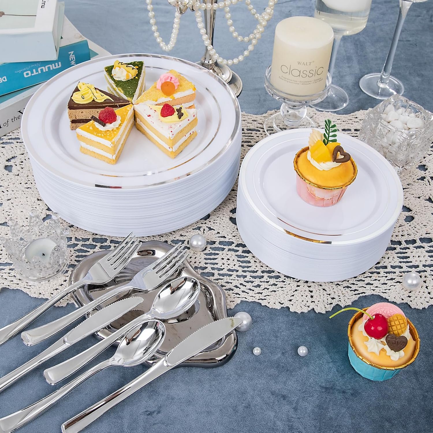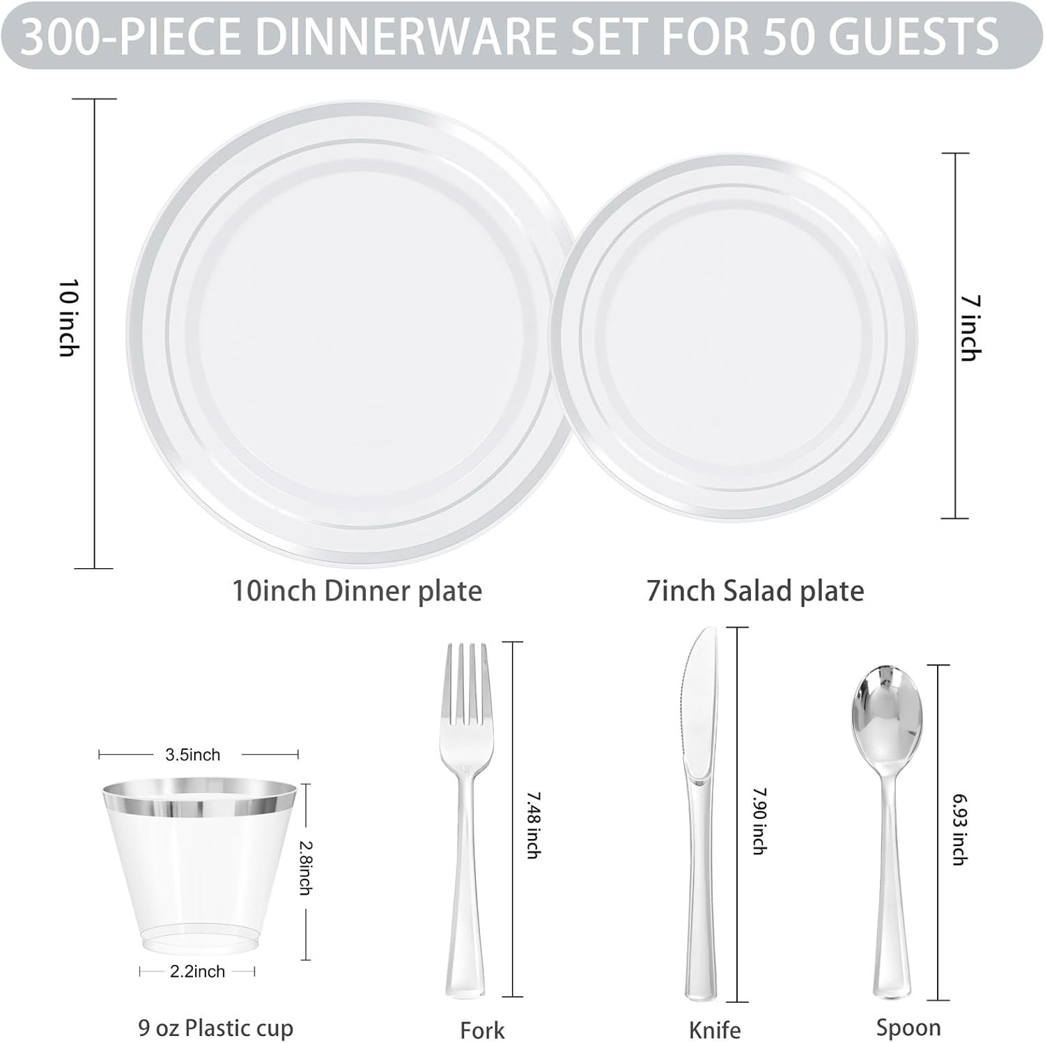 Disposable and Hassle-Free: With these 50 guests plastic dinnerware set of silver plastic plates, cups, knives, forks, and spoons, you can host a party without the worry of cleanup. Simply dispose of the used items after the event, eliminating the need for time-consuming washing