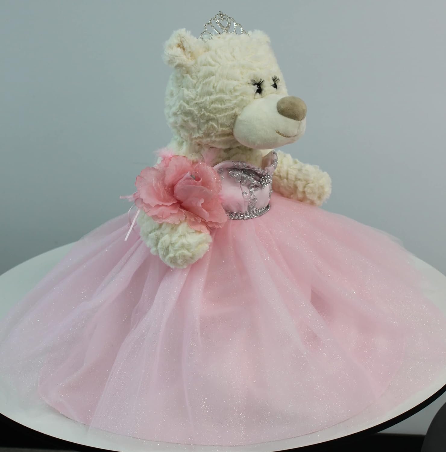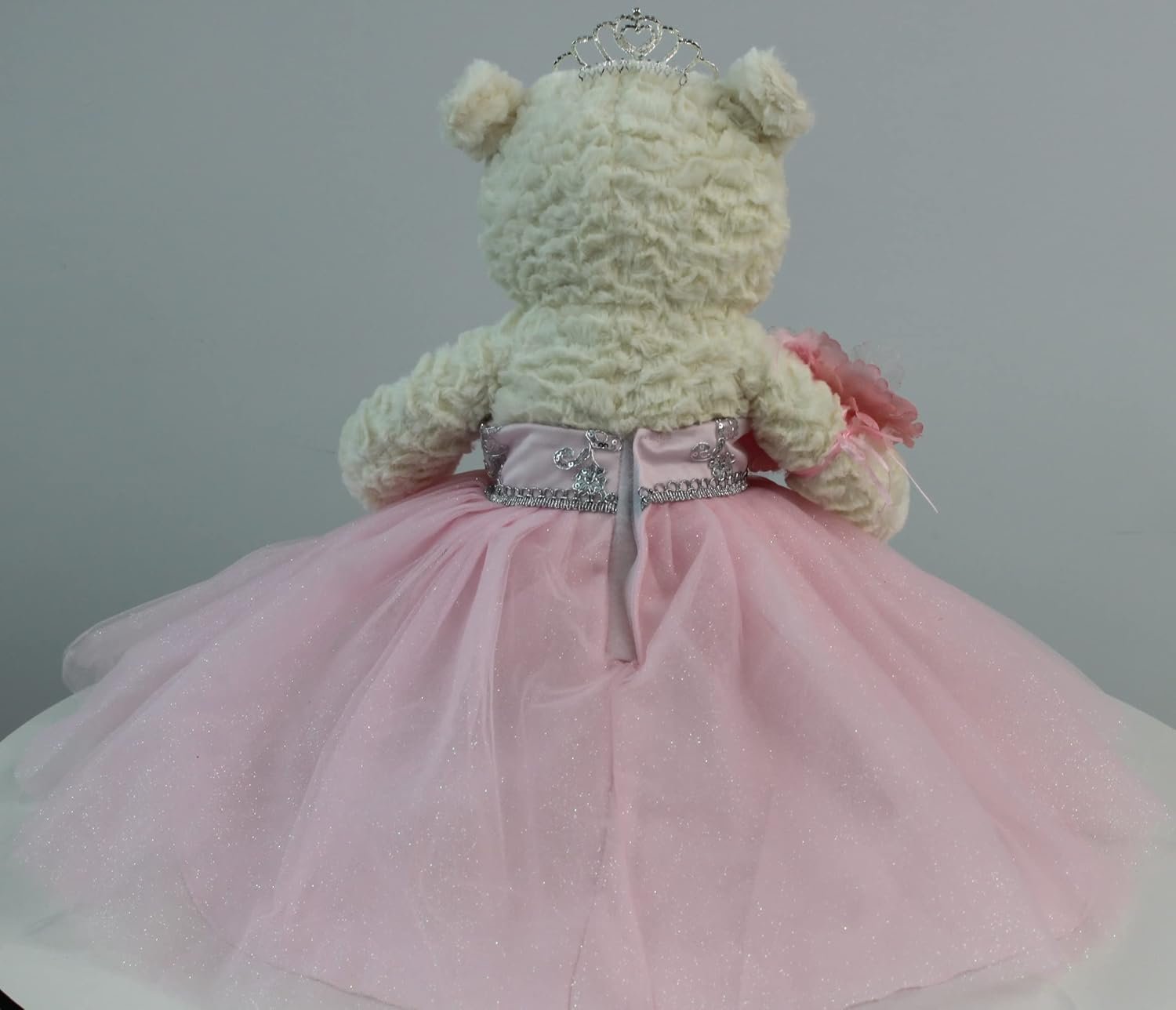 For those that are looking for something other than a doll… we now have the option of Quince Bears. These bears measure 16″ long. Crème color, soft and cuddly, dressed in an elegant, glamorous gown. Unique with long curled lashes. The bust of the dress is decorated with sequins and and the skirt is made up with 3 layers of tulle and satin. The right leg of the bear is embroidered with “Mis 15 Años”. Complete and accessorized with a little rhinestone tiara, earrings, matching color wrist bouquet.