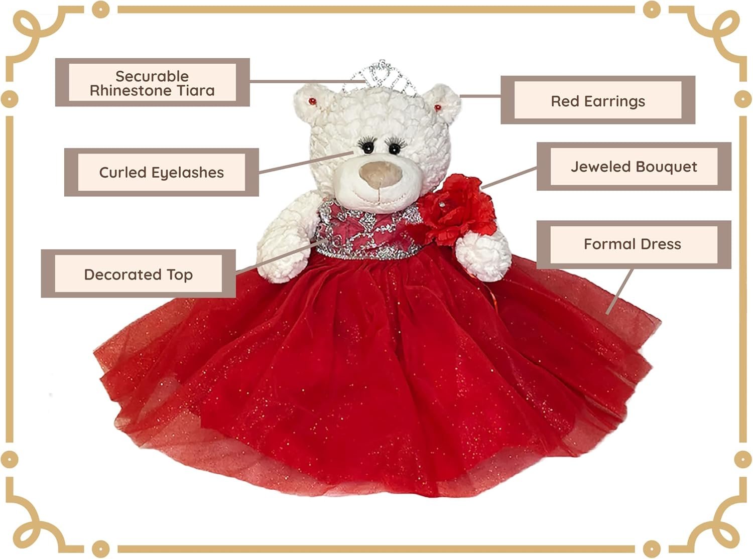 For those that are looking for something other than a doll… we now have the option of Quince Bears. These bears measure 20″ long. Crème color, soft and cuddly, dressed in an elegant, glamorous gown. Unique with long curled lashes. The bust of the dress is decorated with sequins and and the skirt is made up with 3 layers of tulle and satin. Complete and accessorized with a little rhinestone tiara, earrings, matching color wrist bouquet.
