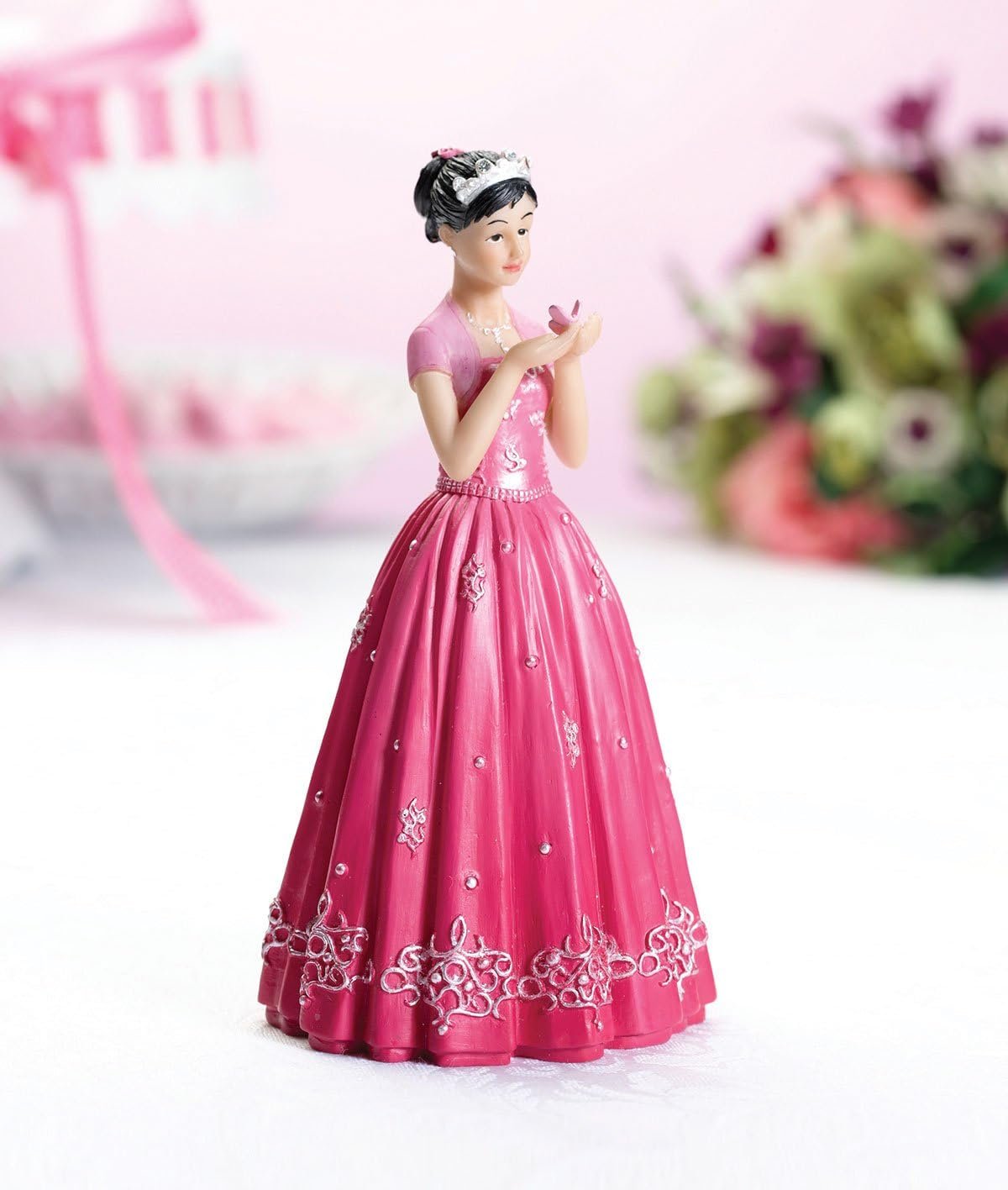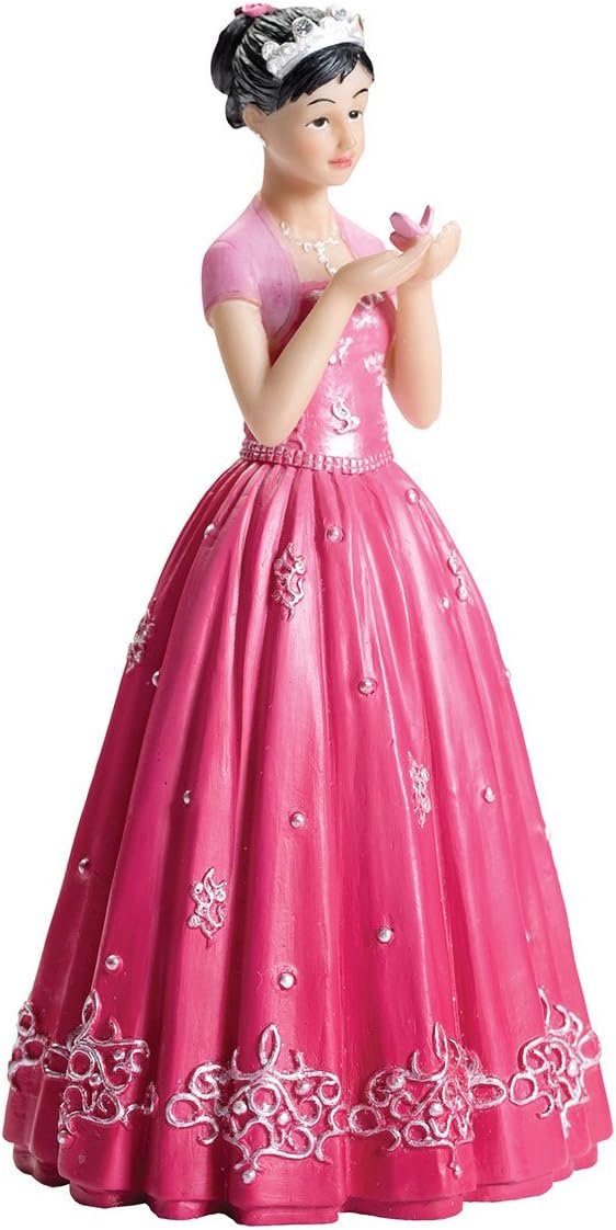 Lillian Rose 6″ Quinceanera Figurine. Standing 6″ Tall and 3.375″ Wide, This resin Quinceanera Figurine makes a great cake top. The beautiful Hot pink dress is accented with silver scroll designs. In her hands is a delicate pink butterfly.