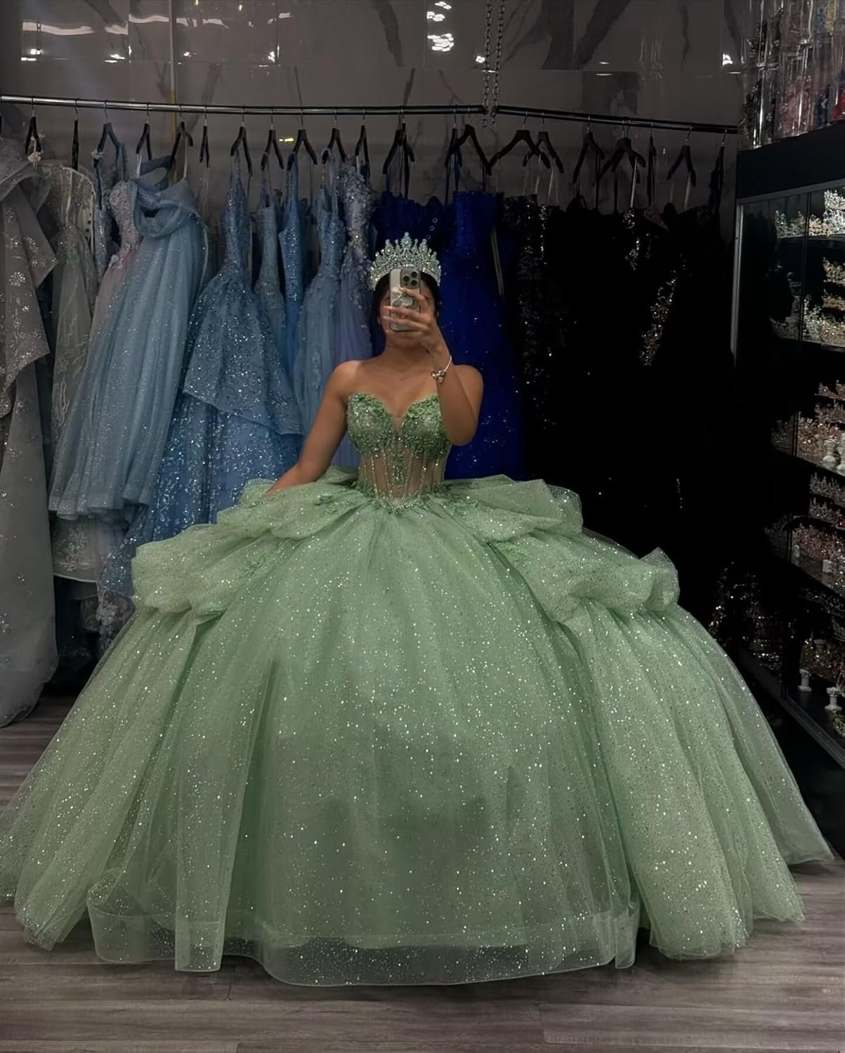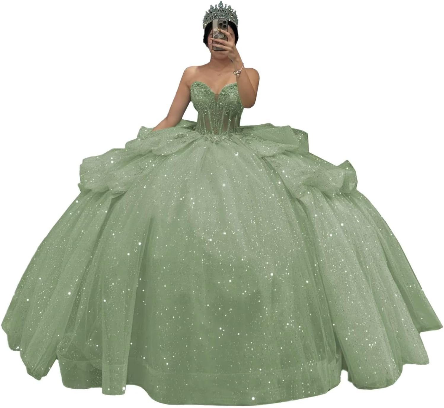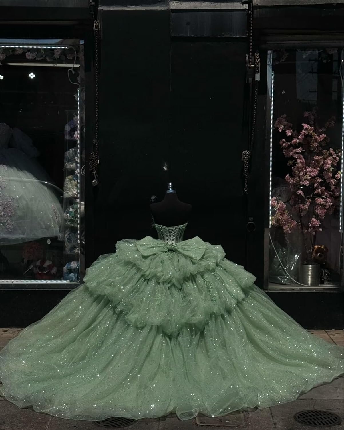 tulle sparkly quinceanera dress with bow Sage Green Quinceanera Dress