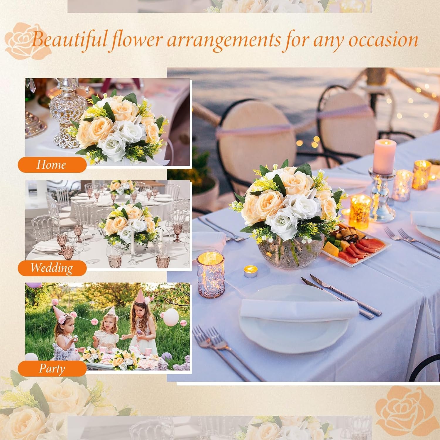 Ideal for Decorating Various Events: apart from decorating weddings, these faux flower centerpieces are ideal for a range of events, including engagement parties, baby showers, and birthday celebrations; They can be hung on trees, ceilings or used as table centerpieces, making them a versatile decor accessory for any occasion