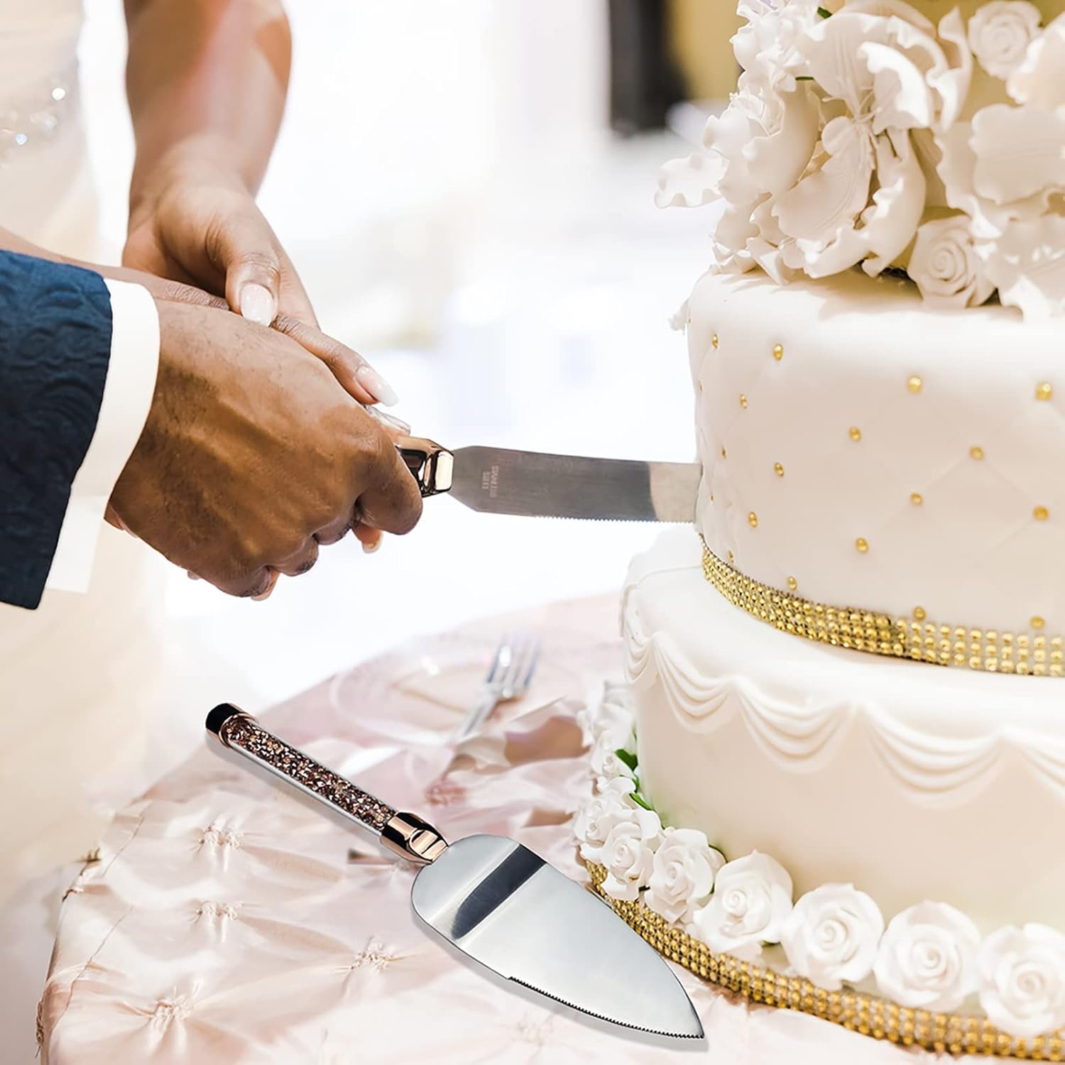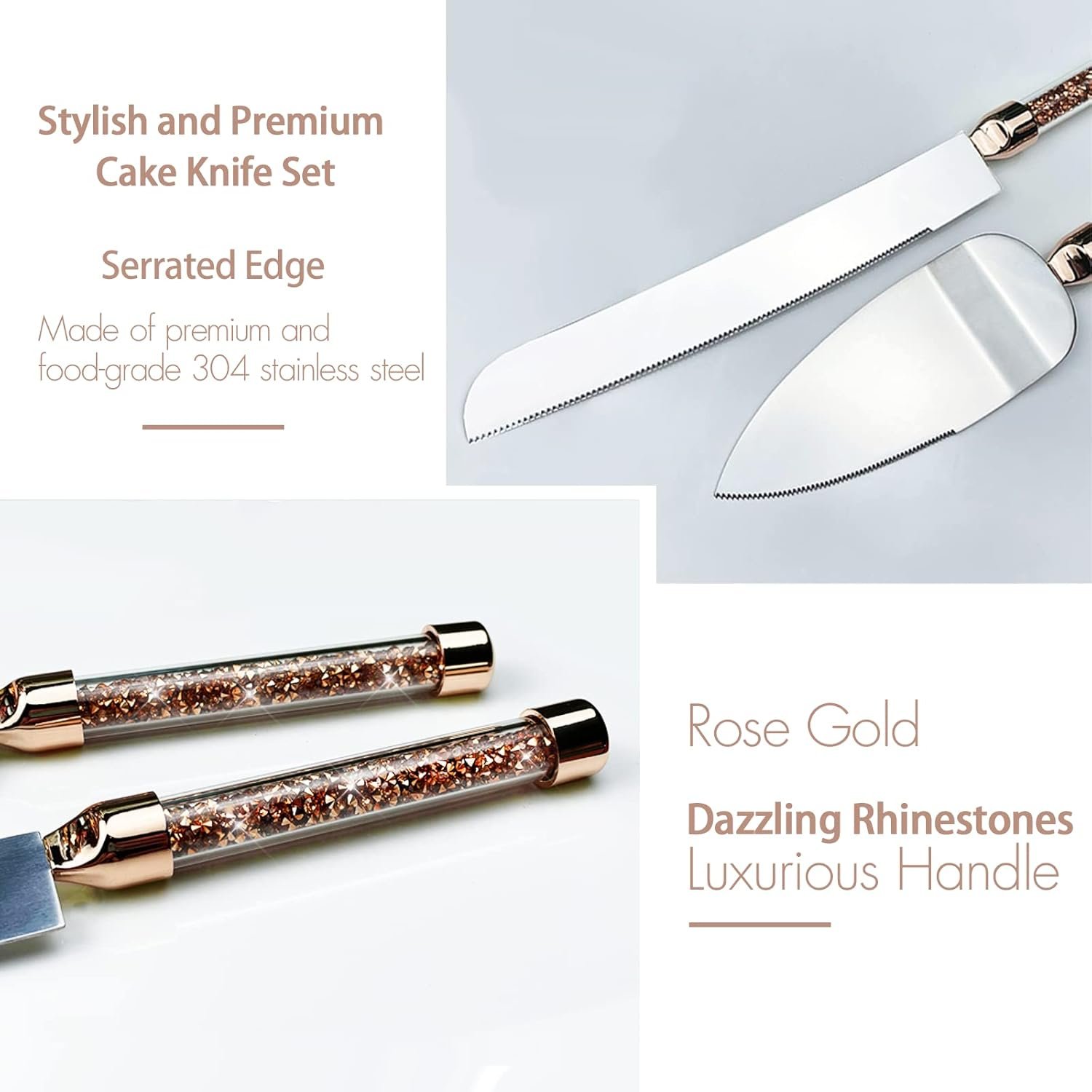 Wedding Cake Knife and Server Set: The wedding cake knife and server set are made of premium golden 304 stainless steel. Golden diamond-like rhinestones are filled inside the handle which create a sense of luxury and elegance, and make this cake cutting set for wedding unique