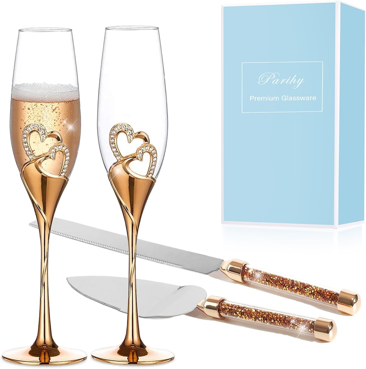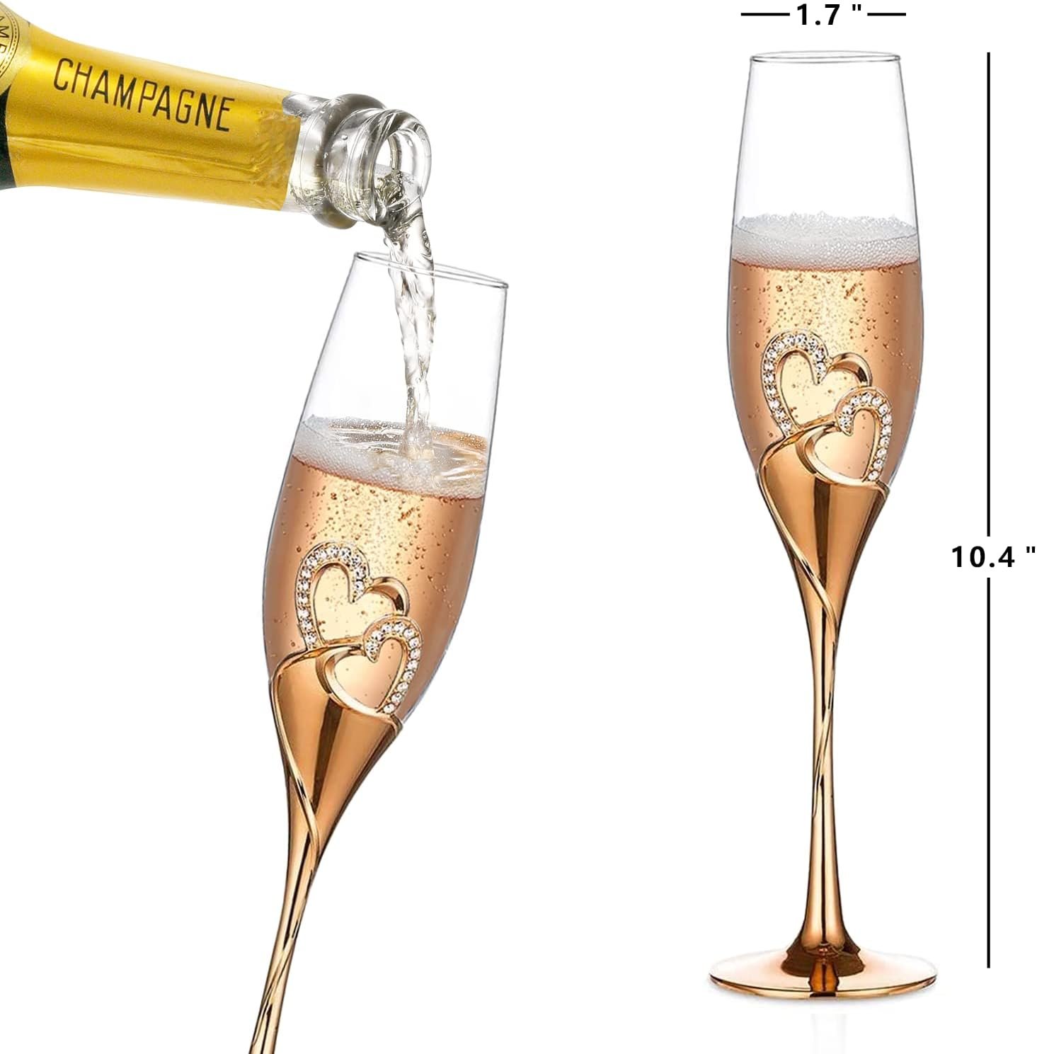 Elegant and Exquisite Design: Parihy Mr and Mrs champagne flutes glasses are crafted from beautiful artisan designs. Each elegant champagne glass is designed with elegant Interlocked Hearts gold metal base and encrusted with 23 sparkling, diamond-like rhinestones. All the champagne flutes for Bride and Groom are made from wonderful sparkle lead-free crystal glasses, tempered for durability and carefully crafted
