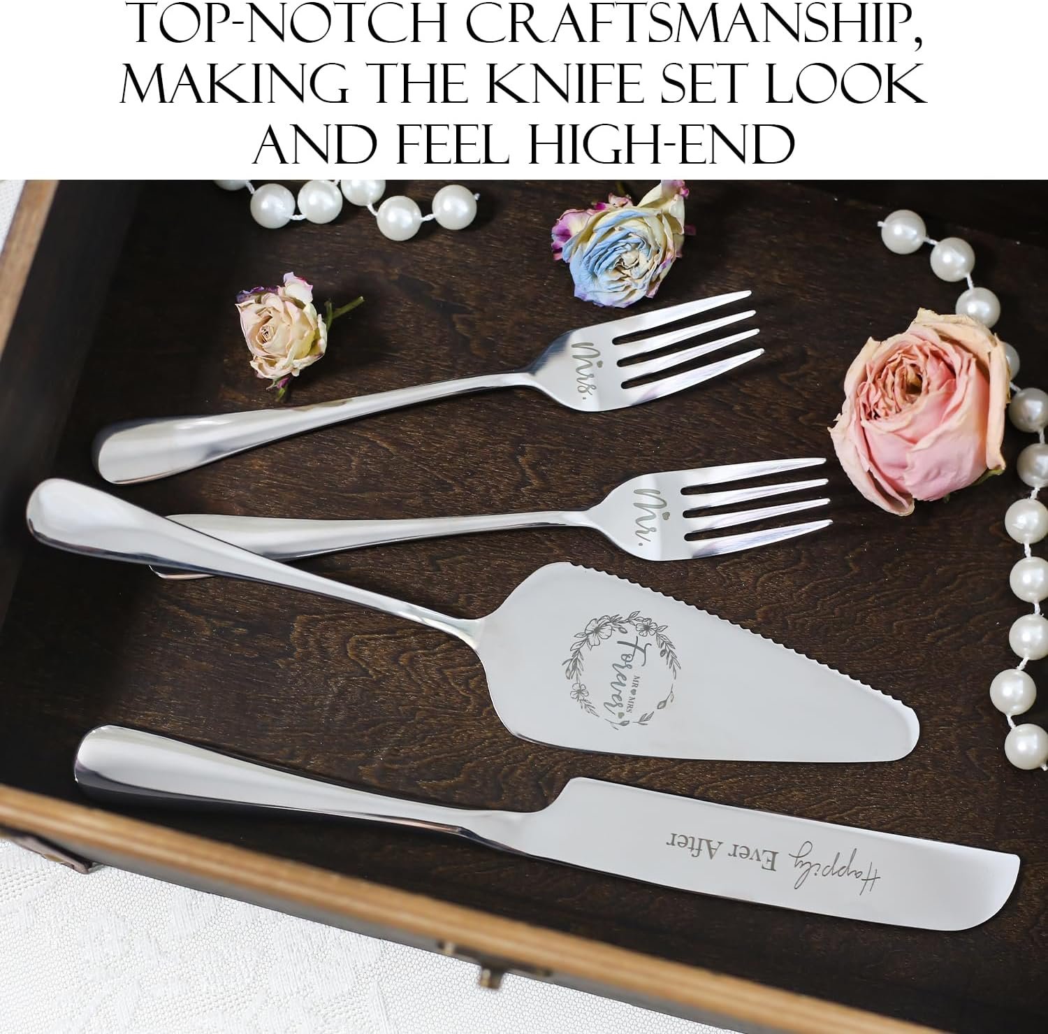 【Wedding engagement Cake Cutting Set with Mr and Mrs】Make your wedding unforgettable with our premium cake cutting set! We have upgraded this elegant set includes an extra set of forks which engraved with “Mr and Mrs”. Our wedding cake knife and server set made from high-quality 304 stainless steel, safe and anti-rust. Its trendy and modern design never goes out of style, and the engraved words “Mr mrs forever,Happily ever after” add a romantic touch. Order now and make your wedding day perfect.