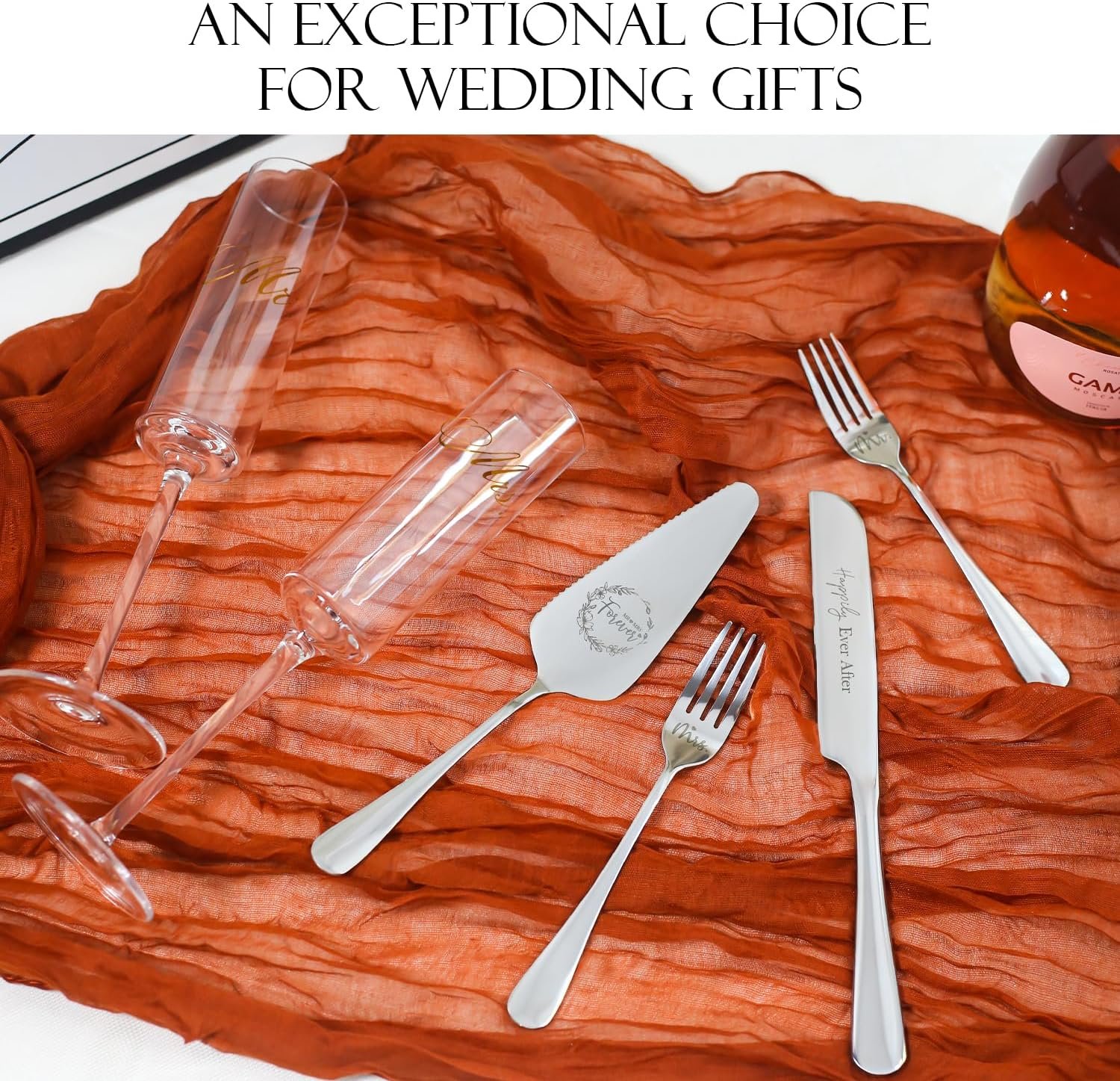 【GREAT GIFT SET FOR Wedding,engagement 】The new couple can enjoy their favorite any drink with our MR and mrs wedding champagne glass!This set includes two champagne flutes and a Wedding Cake Cutting Set in a premium wooden gift box engraved with “Mr and Mrs” and wedding ring.It’s a perfect present for Wedding, Anniversary, Engagement, Valentine’s Day, Thanksgiving, Christmas, and any other special occasions.