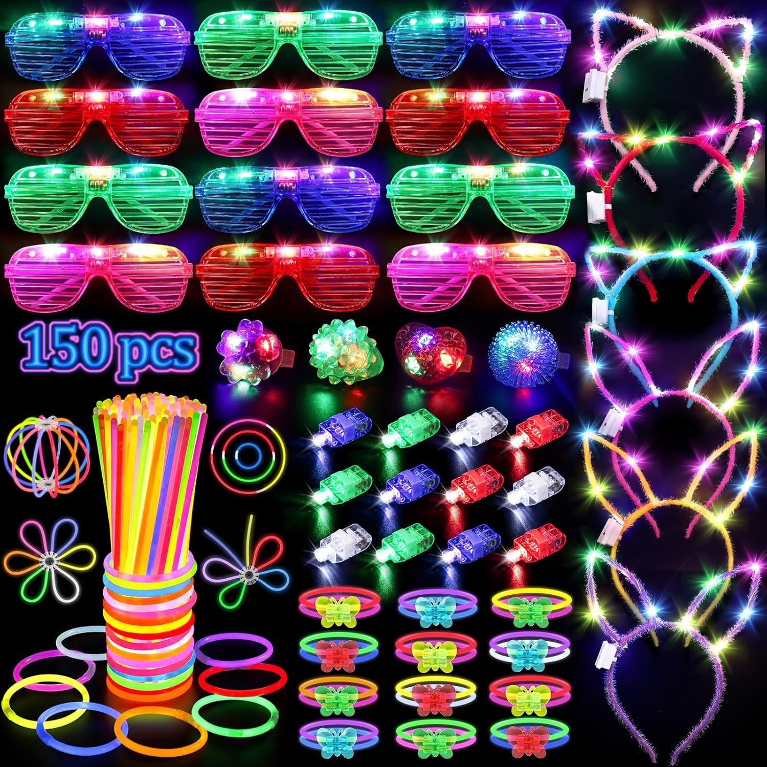 Super Value Glow in The Dark Party Favors Set — Good variety of light up toys and light up accessories for glow party, includes 12 * LED glow party glasses, 6 * LED light up headbands, 12 * LED finger lights, 4 * light up rings, 100 * neon glow sticks, 12 * butterfly bracelet connectors, 4 * ball / flower connectors, 100 * normal connectors. Ultra bright glow in the dark stuff and accessories for neon glow party supplies, neon party favors, neon party decorations and props, new years eve party supplies 2025