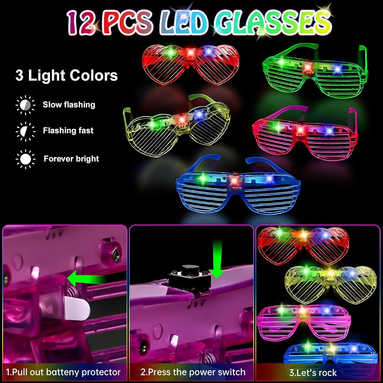 156 PCS Glow in the Dark Valentines Day Party Supplies, 12 Light Up Pop Tubes, 12 LED Glasses, 12 Light Up Headband, 20 Finger Lights and 100 Glow Sticks, Neon Party Favors for Glow Party, Birthday