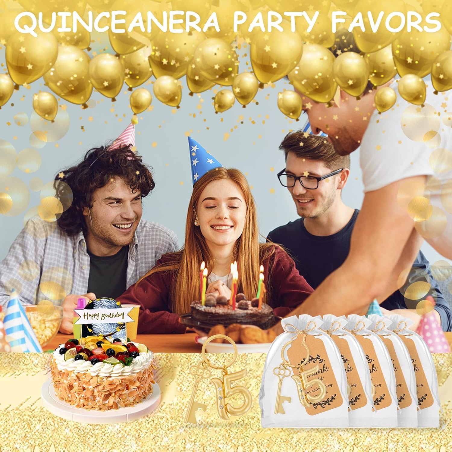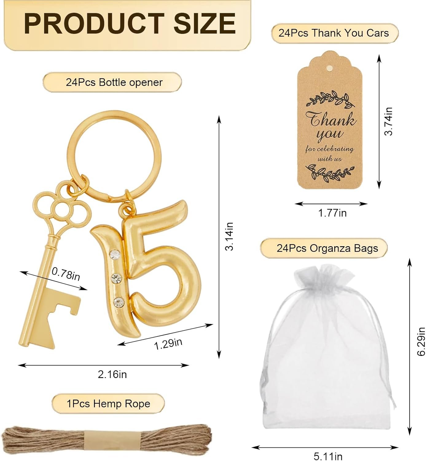 Packaging Content : The birthday and wedding anniversary party gifts we provide to our guests include 24 15th birthday bottle opener keychains, 24 thank you tags, 24 white gauze bags, and 1 bundle of jute thread. The sufficient quantity and exquisite craftsmanship can meet your various party preferences, leaving a deep impression on family and friends.