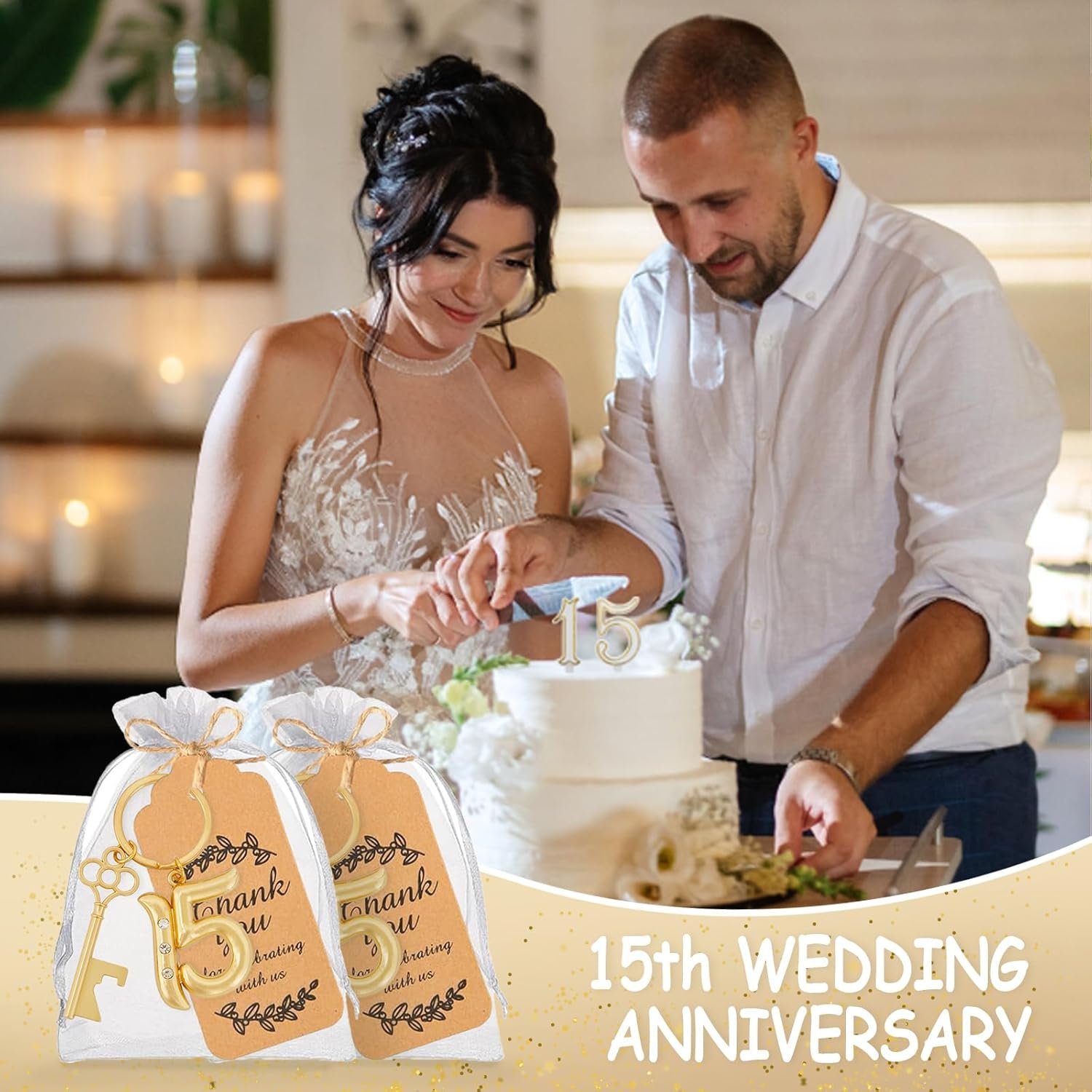 Exquisite Design : The 15th anniversary commemorative party souvenir features a golden number 15 rhinestone appearance and a keychain bottle opener design, which can present a unique retro style. Paired with a “thank you” card and hemp rope, it makes the packaging more attractive and adds more charm to the party. It has a compact structure, is easy to carry and store, and the bottle opener function allows your guests to easily open their favorite drinks.