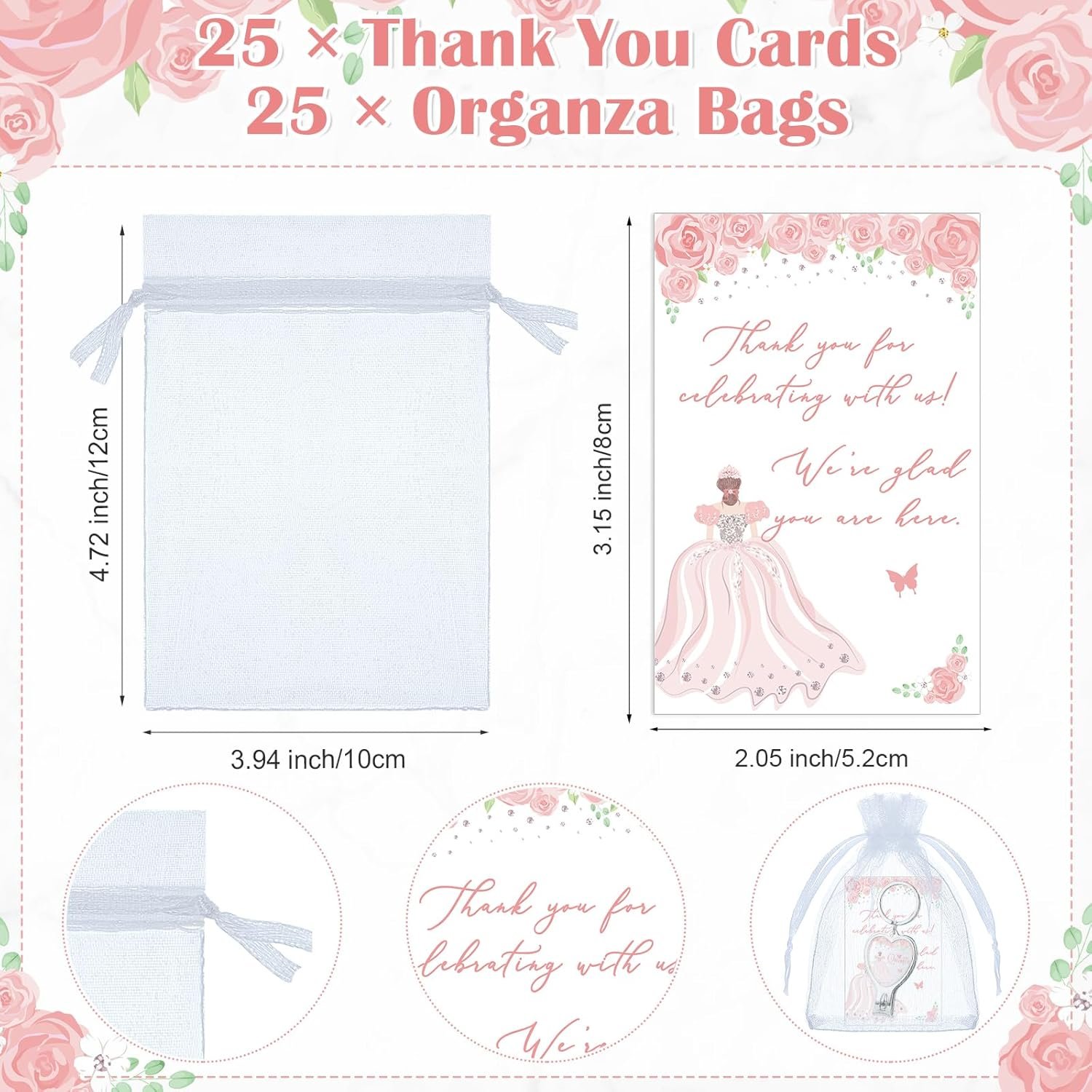 Portable and Convenient Sizes: the compact sizes of the quinceanera gifts for guests in the party pack make them easy to transport and utilize; The bottle openers measure around 3.54 x 1.18 inches/ 9 x 3 cm, while the cards and organza bags have dimensions of approximately 2.05 x 3.15 inches/ 5.2 x 8 cm and 3.94 x 4.72 inches/ 10 x 12 cm, respectively