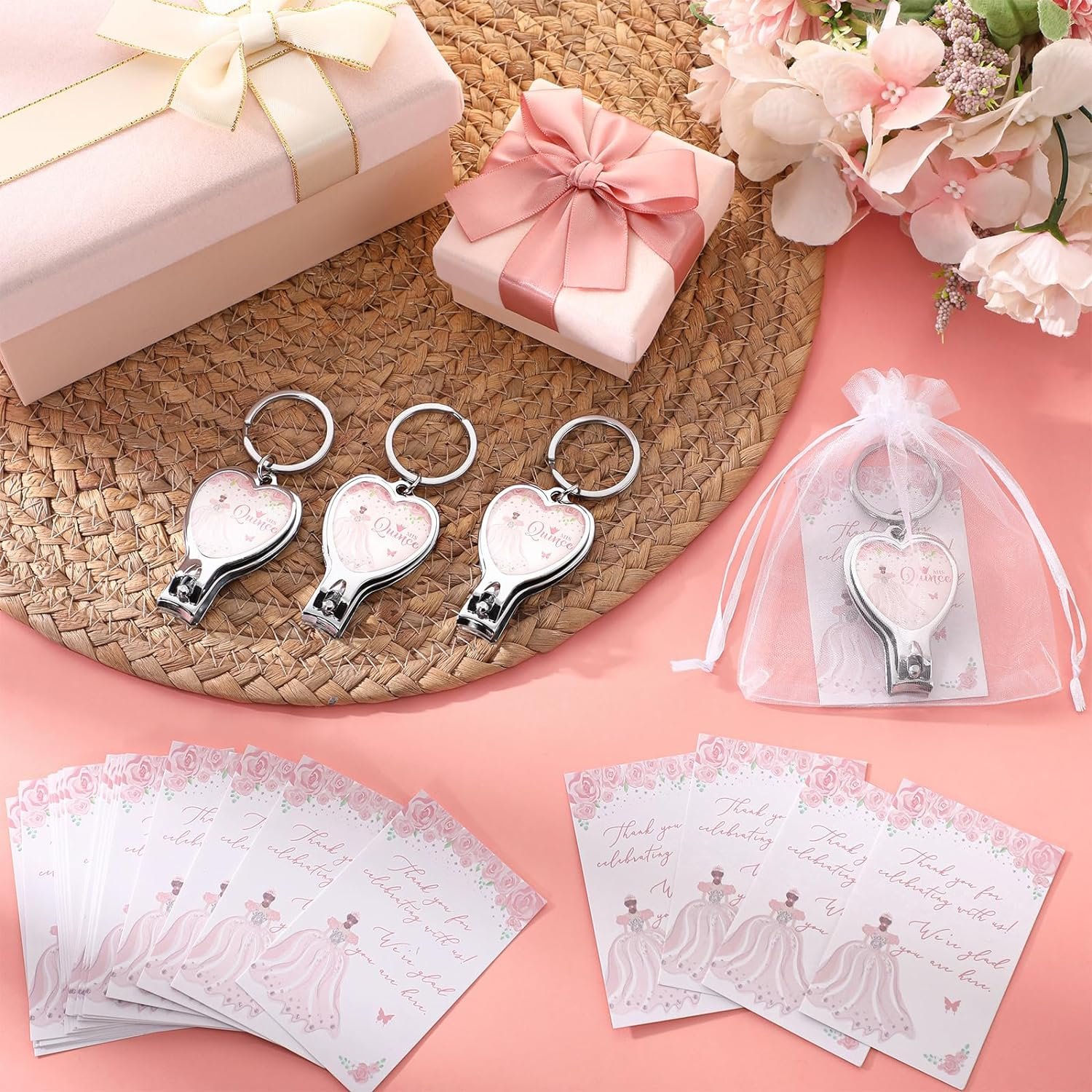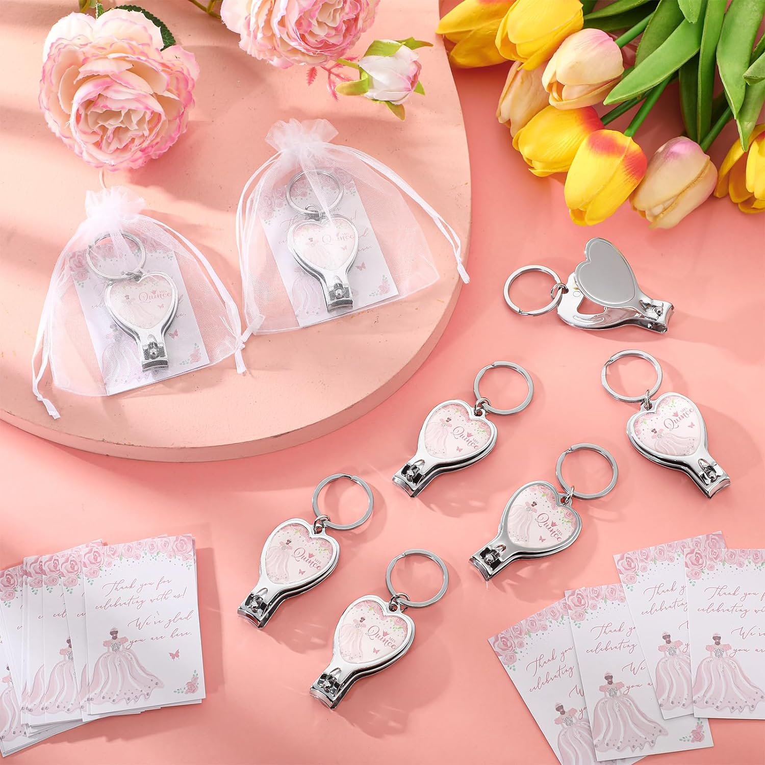 25 Sets 15th Quinceañera Party Favors Includes Quince Multi Function Keychain Bottle Opener Nail Clipper Thank You Cards Organza Bags for Guests Sweet 15 Birthday Party Adults Souvenirs