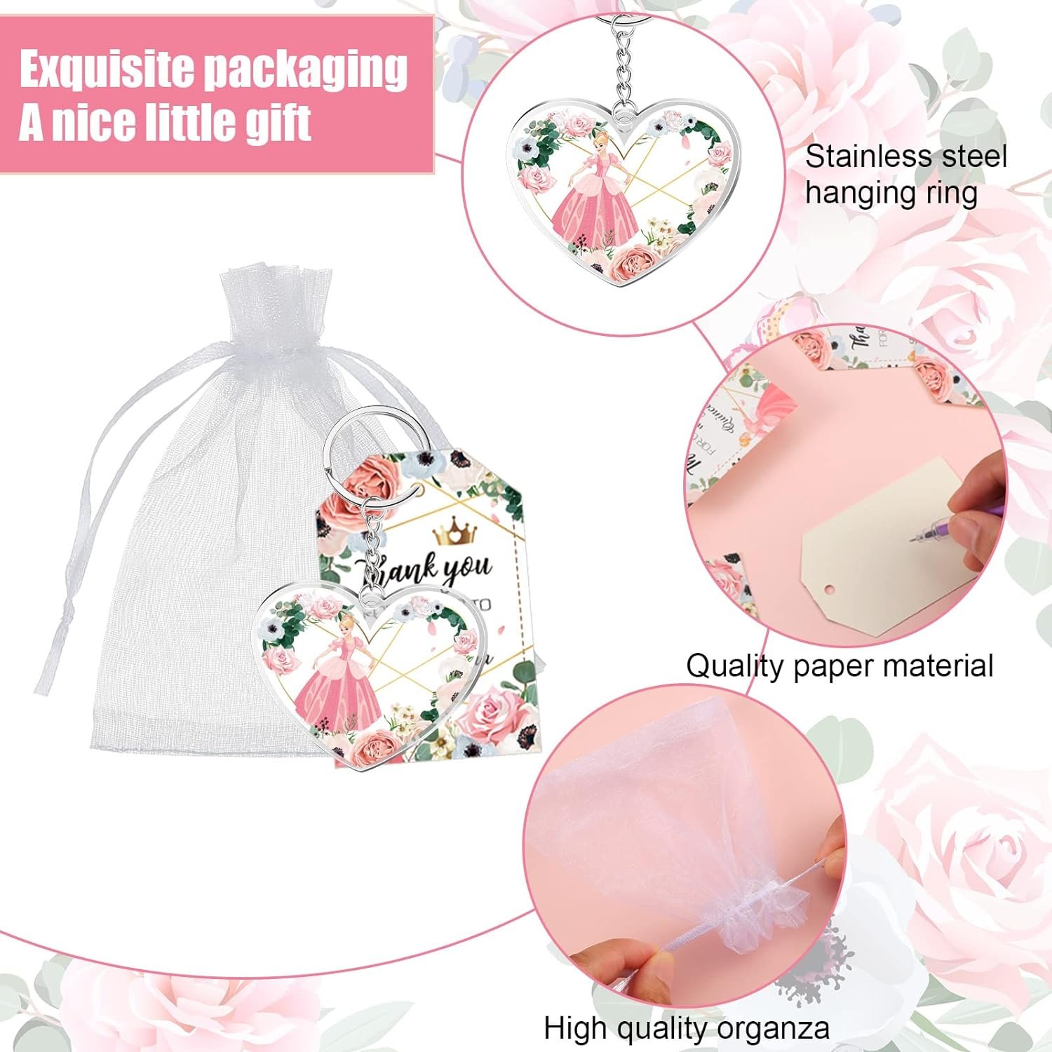Beautiful Appearance: these quinceanera gifts adopt a heart shaped design, printed with the patterns of princess and pink flowers on the surface, which will give a romantic and sweet feeling to people; And each thank you tag leaves enough space for you to write down your blessings