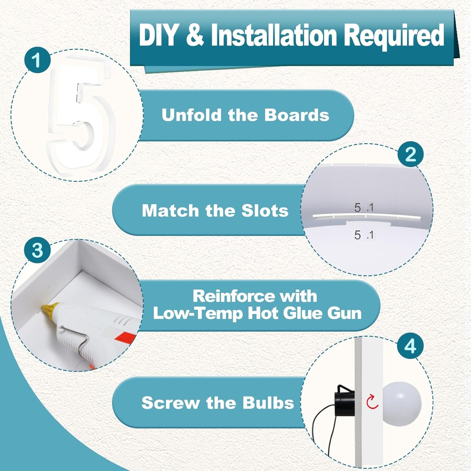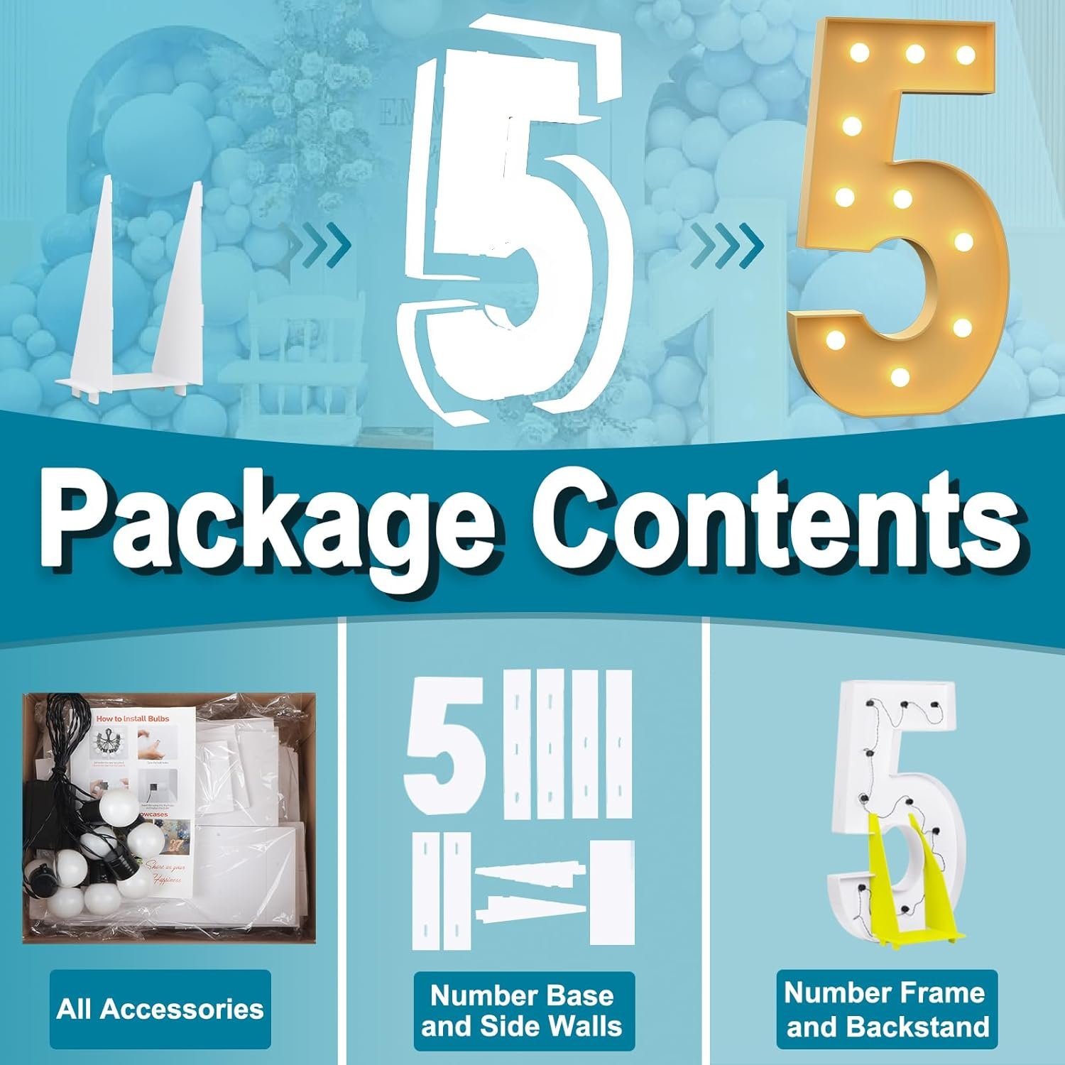 【THE PACKAGE KIT INCLUDES】Foam board base for numbers, foam board sides for numbers, Instruction Manual and light bulb string. It is convennient to install the light bulb and you don’t need to purchase light strings again. Balloons and hot glue guns are not included.