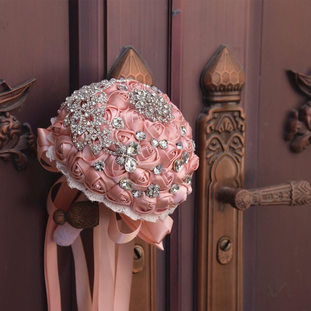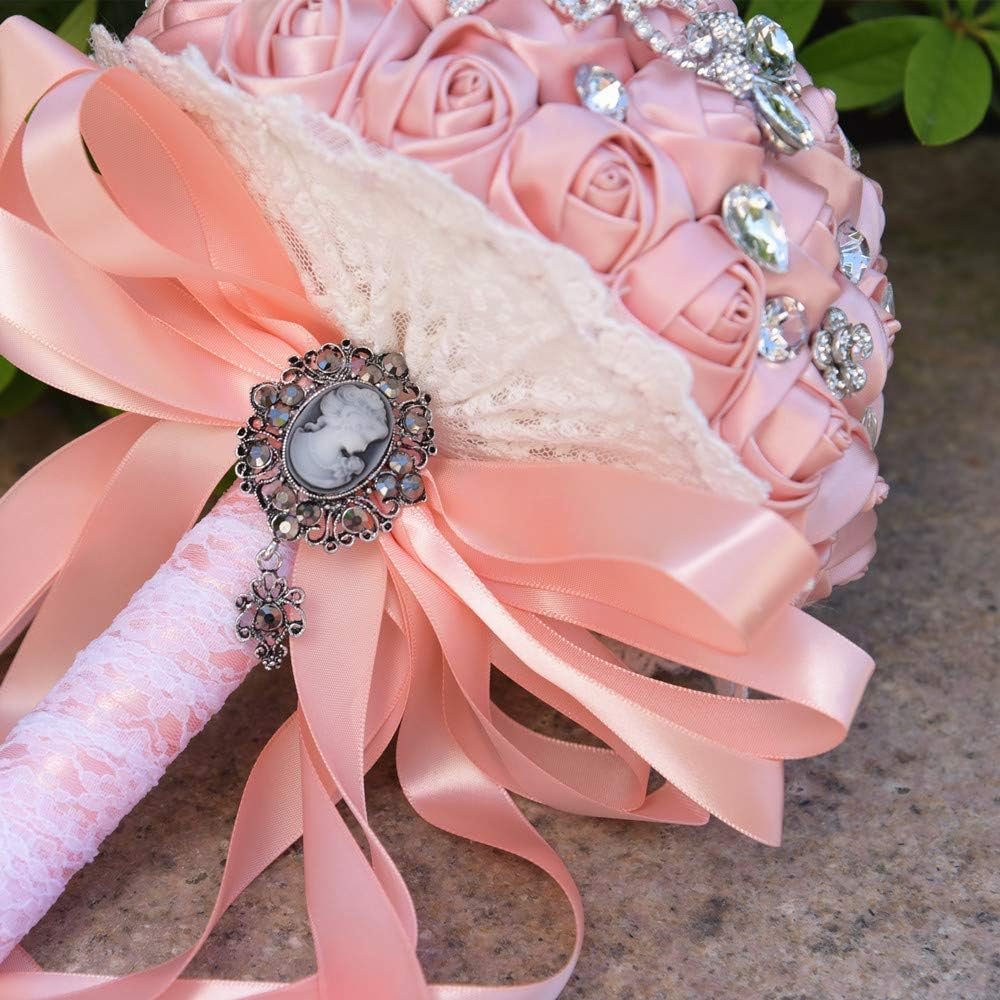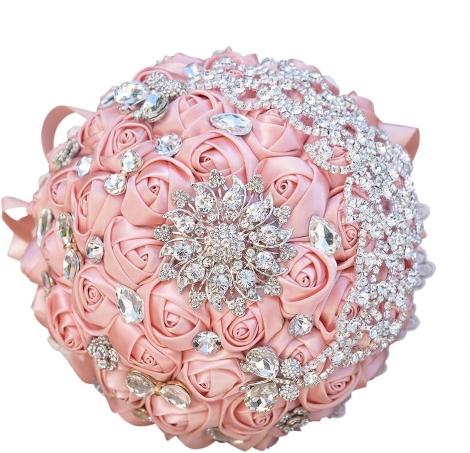 Abbie Home 8 Inches Sparkle Rhinestone Brooch Bouquet – Satin Rose Quinceanera Bouquets Bride Bridesmaids Wedding Flower with Crystal Jewelry Ribbon Décor (Blush Pink)