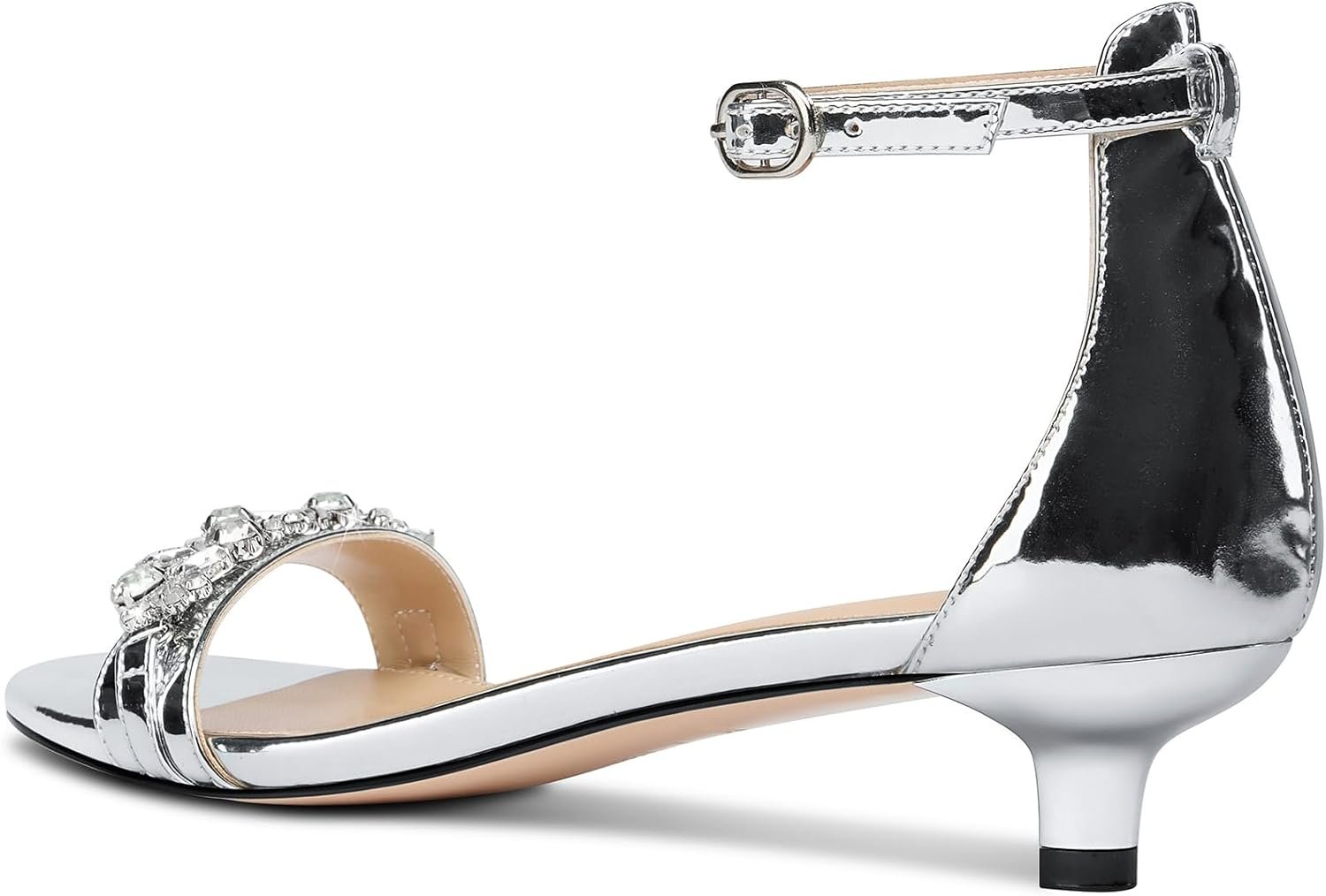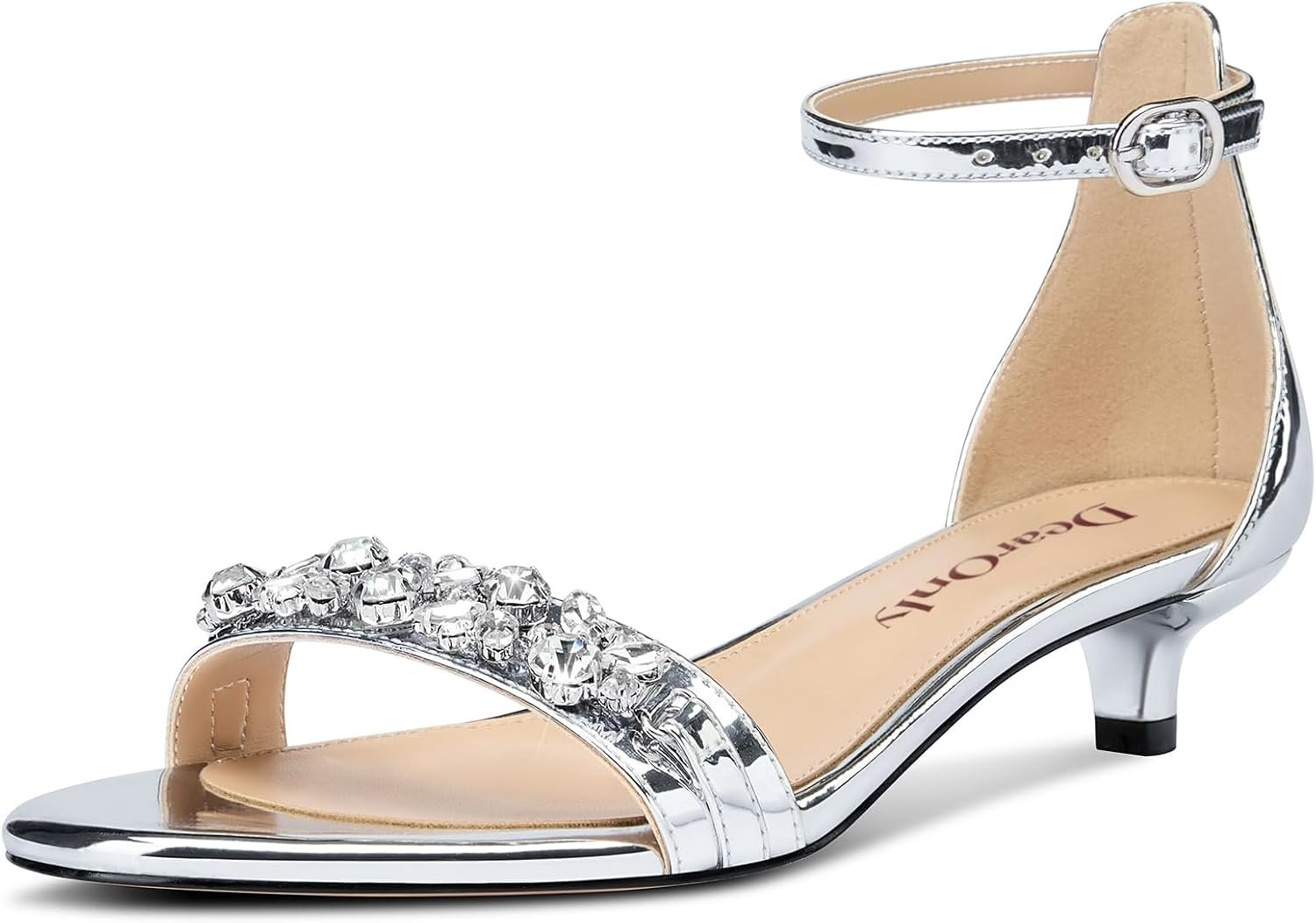 DearOnly Womens Low Kitten Heel Peep Open Toe Ankle Strap Sandals Rhinestone Crystal Buckle Office Summer Dress 1.4 Inches Heels