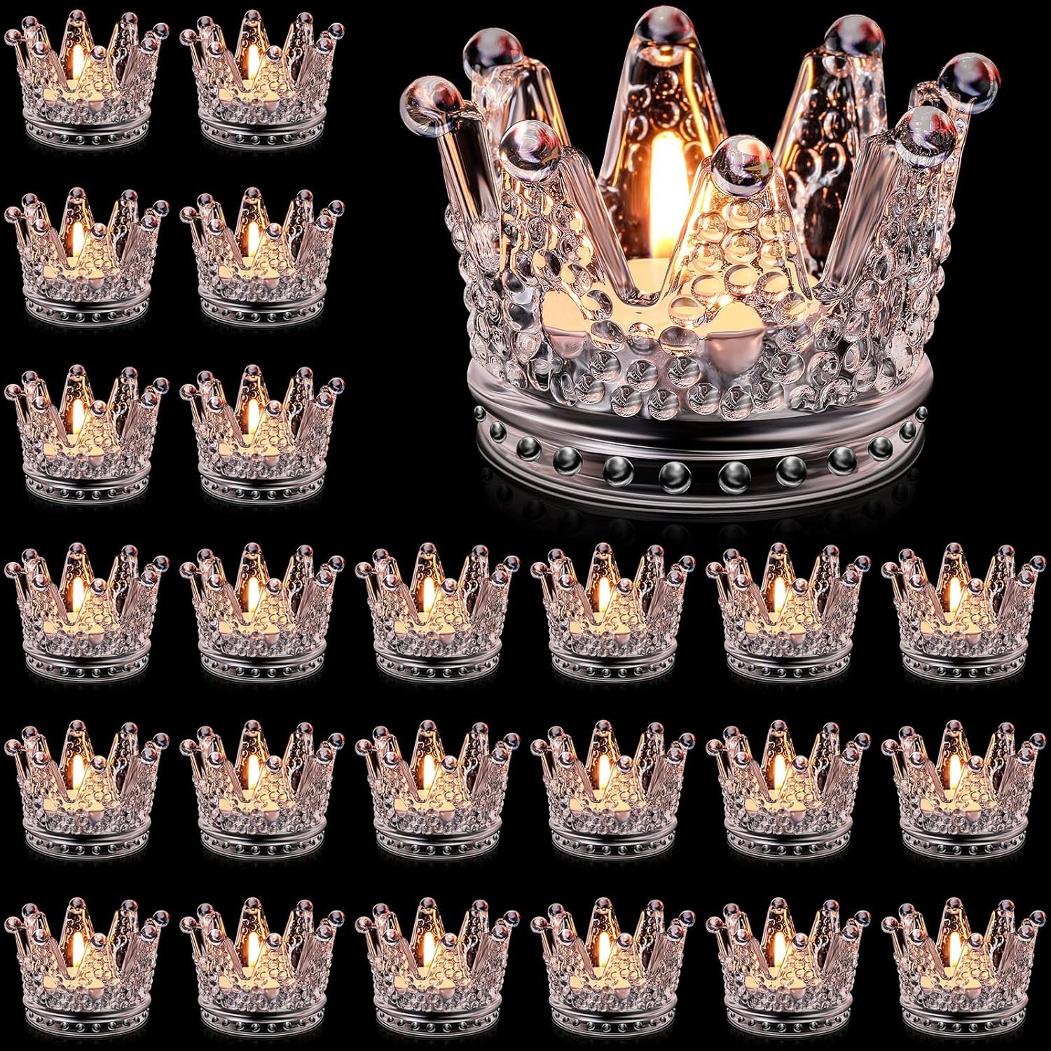 24 Pcs Clear Votives Crown Candle Holders Glass Crown Tealight Candle Holders Bulk Candlestick for Tables Centerpieces Wedding Valentine’s Day Party Decoration(Clear Style)