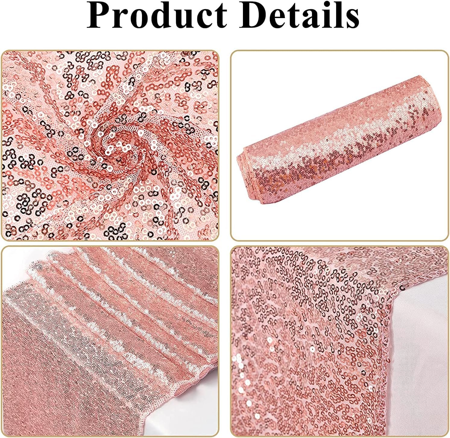 Rose Gold Sequin Table Cloth for Rectangle Tables Sparkle Table Covers for Wedding Engagement Birthday Party Holiday Decorations Baby ShowerThese glitter table runners are made of high quality density sequin fabric,includes 3MM round high density sequins material with mesh fabric backing. There are lightweight, wrinkle free, no pungent smell.
