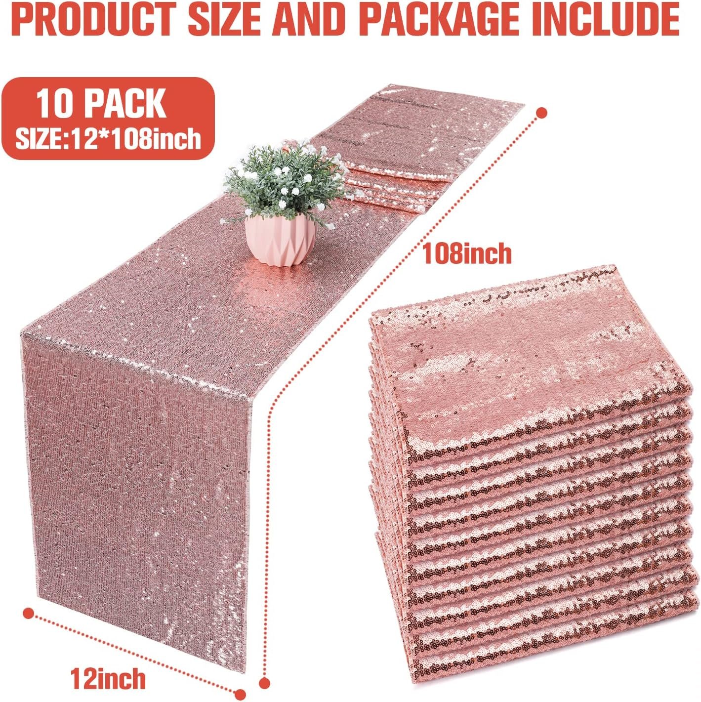 10 pack rose gold sequin table runners,measures 12″ x 108″in each size,appropriate for a table that can seat 8-10people.