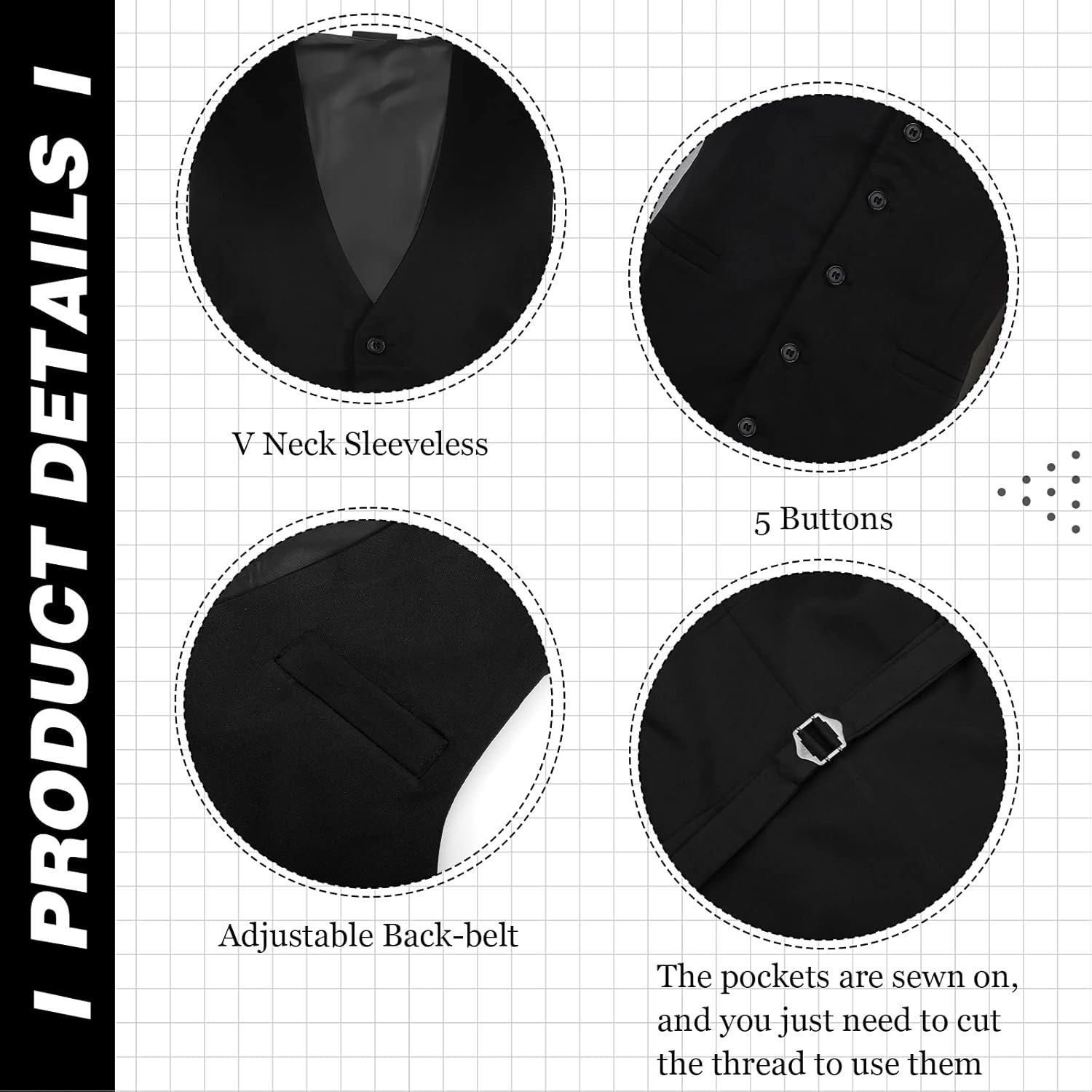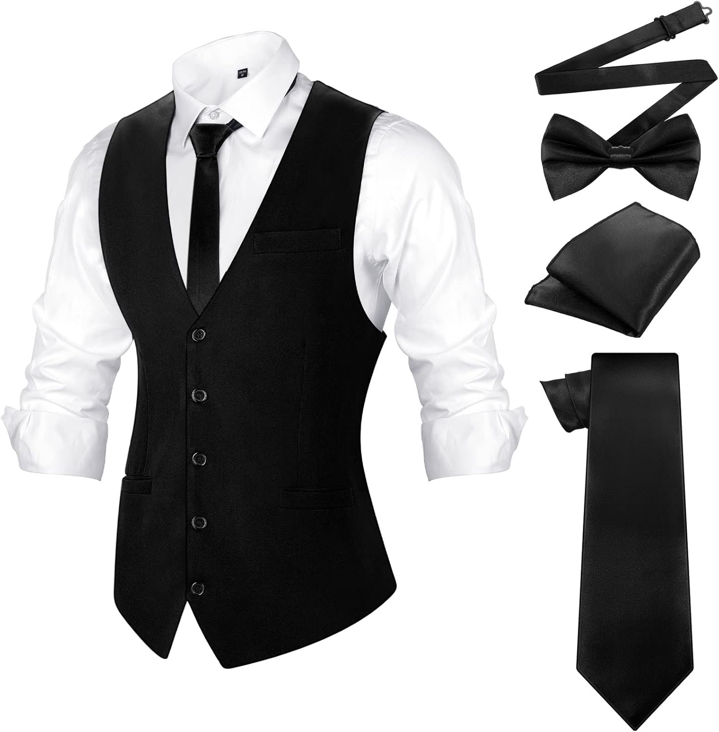Men’s Formal Vest Set Business Classic Waistcoat with Necktie Bow Tie and Pocket Square for Tuxedo Wedding Dress